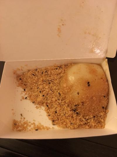 油で煮た⁇すごーく柔らかいお餅にピーナッツ?きな粉がたくさんかかっていて想像以上に美味しいし、ペロリと食べてしまいます。