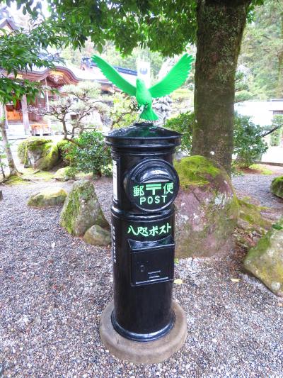 2019年1月 ここの境内にある有名な黒い郵便ポストの上の八咫烏が、黄緑色になっていました