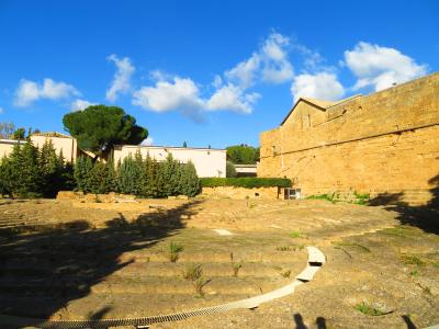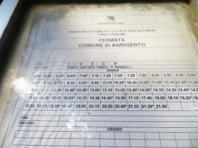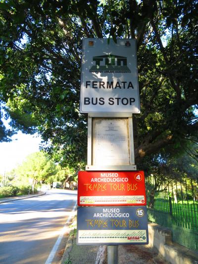 見学後は、アグリジェントの旧市街に行きたかったので、市内方面のバス停は、博物館出口から、左に100mくらい行ったところでした。博物館を出てもバス停が見あたらないので、キョロキョロしていたら、そこらにいたおじさんがバス停の場所を教えてくれました。バスはかなり頻繁に通っています。- 旅行時期