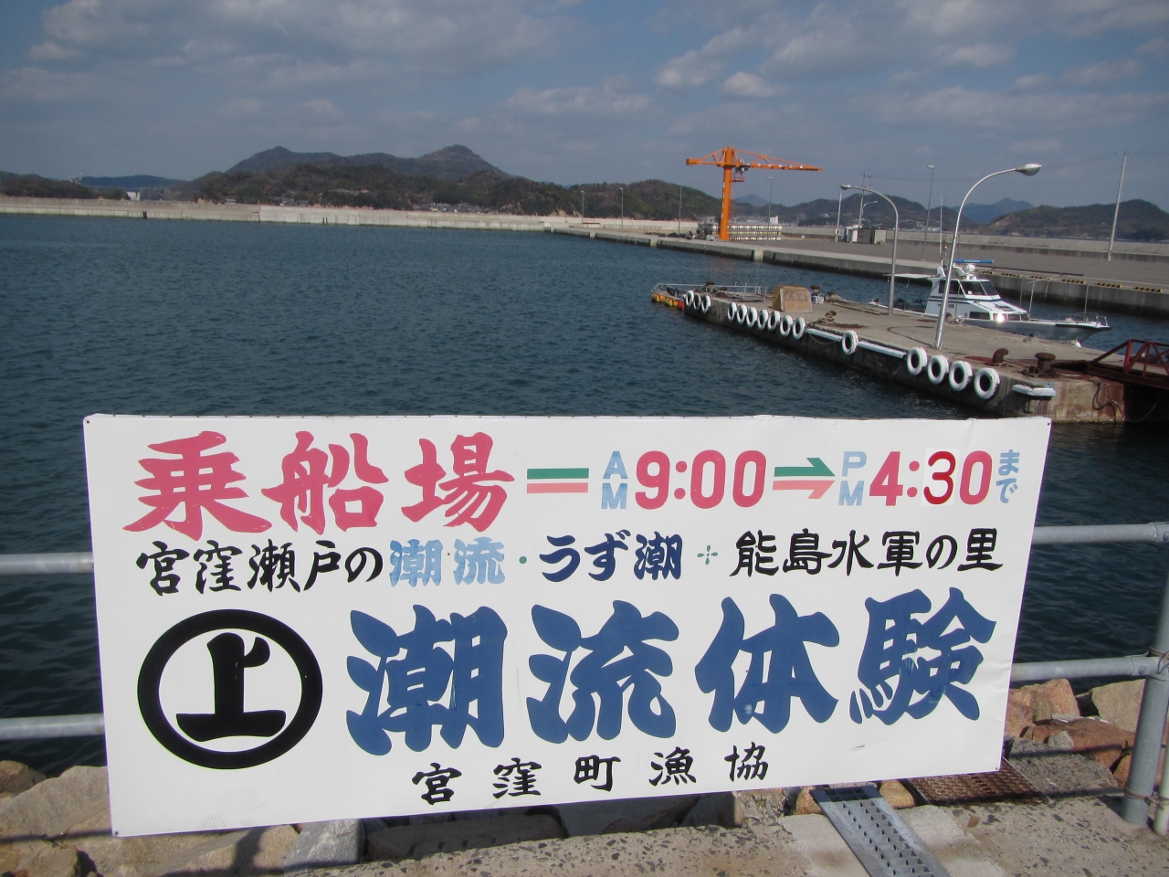 宮窪瀬戸潮流体験は、村上水軍博物館の手前の船着き場から出ます。1時間おきに出ていて、だいたい40分くらいのクルージングです。能島のまわりの急流をめぐります。乗船時は、救命胴衣の着用が必要です。船折瀬戸→見近島→伯方・大島大橋にも行きます。潮流の速さは、潮の具合によって違いますので、HPを確認しましょう。