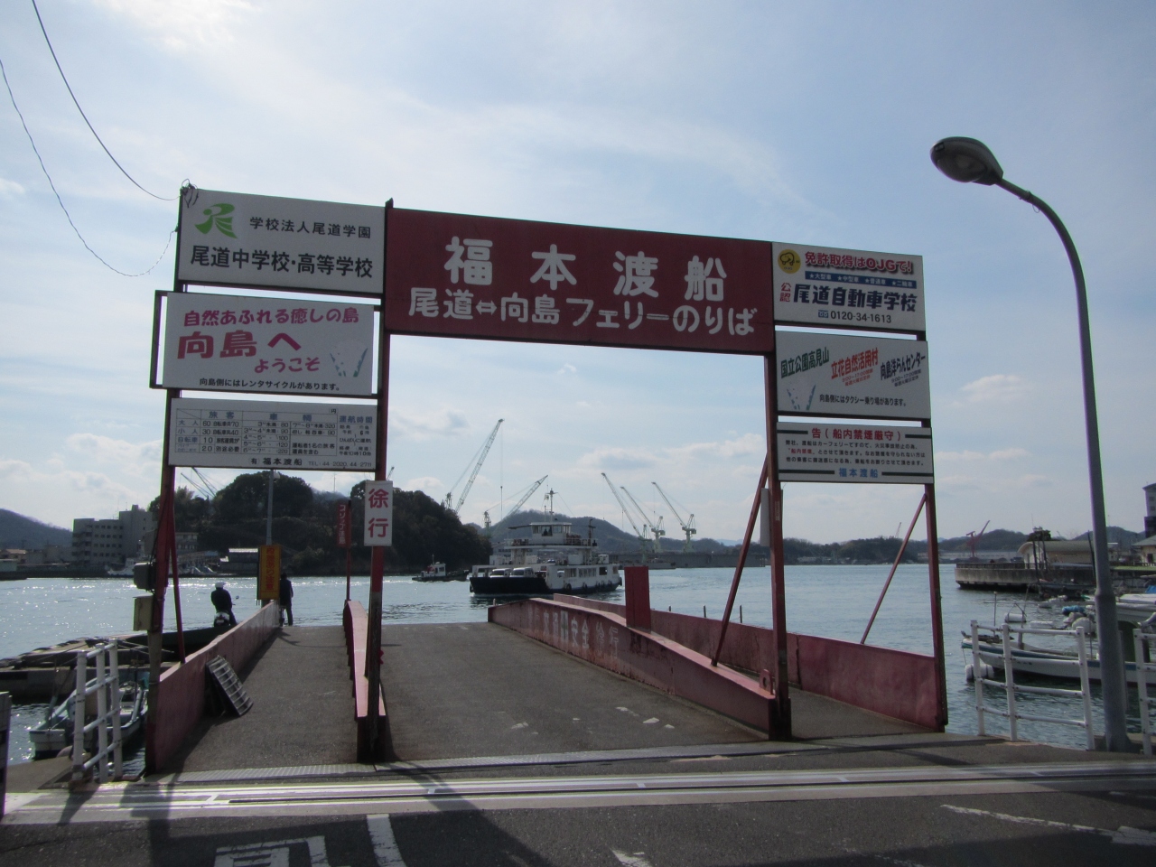 尾道と向島とを隔てる海は「尾道水道」と呼ばれ、この水道には渡船航路が3本運航されています。尾道側から見て、西側から、尾道駅前渡船・福本渡船・尾道渡船です。料金は福本渡船が60円、他は100円です。駅前渡船は、向島で川を上っていくので、少し時間がかかります。駅前渡船と福本渡船の航路は交差しているので、船のかわしあいが絶妙です。
