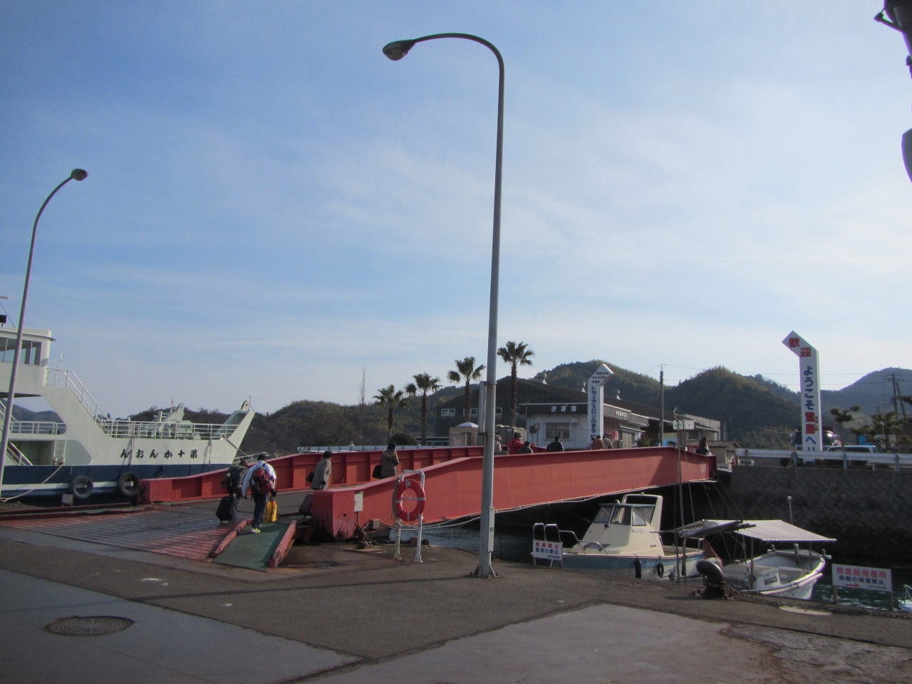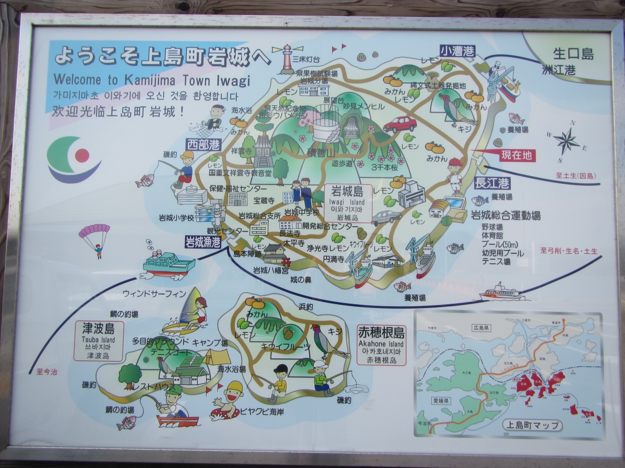 岩城島は、しまなみ海道の島ですが、橋は架かっていません。この島に行くには今治からは、土生港(因島)行きの高速艇が岩城港によります。また、土生港(因島)からは、今治行きの高速艇以外に、長江港行きのフェリーもあります。このフェリーは本数もありますので、便利です。岩城島は、今、(青い)レモンで売り出し中です。長江港の待合所では、無料Wi-Fiが使えました。