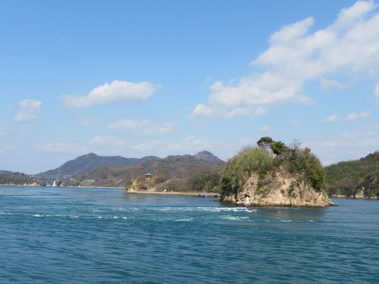 能島は、村上水軍 能島水軍の本拠地だったところです。今も能島城趾が残っています。無人島ですので、この島への航路はありません。村上水軍博物館前から出ている潮流体験の船が近くまで行きます。また、大島の宮窪港と伯方島の尾浦港を結ぶシーセブン有限会社の船が沖合を通ります。狭い海峡になってますので、島の周辺は、時間により早い潮流が渦巻いています。