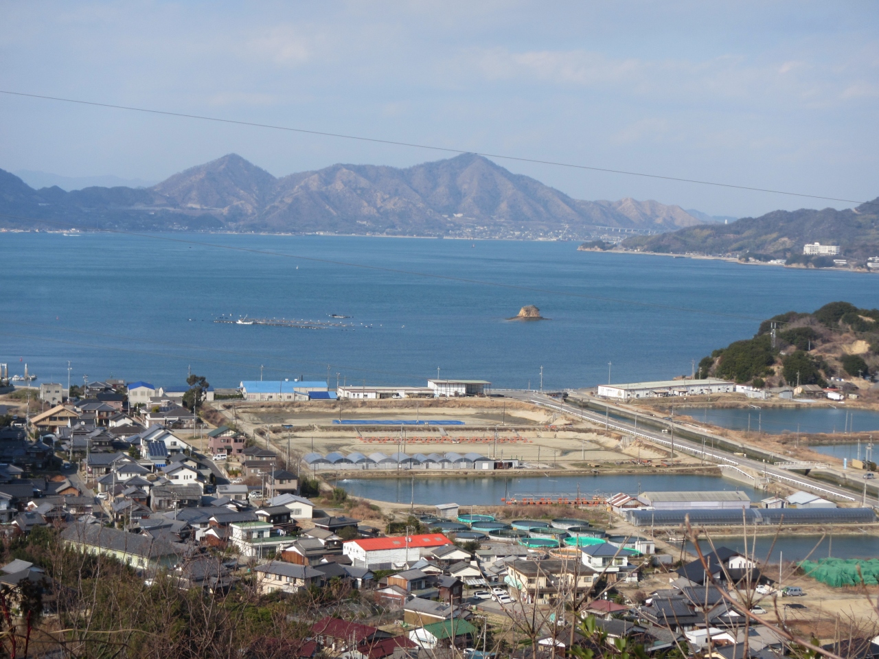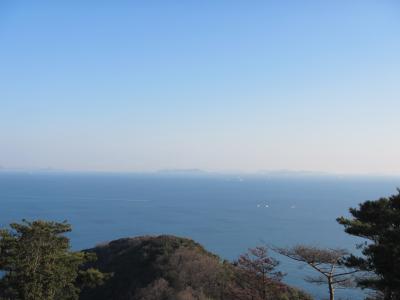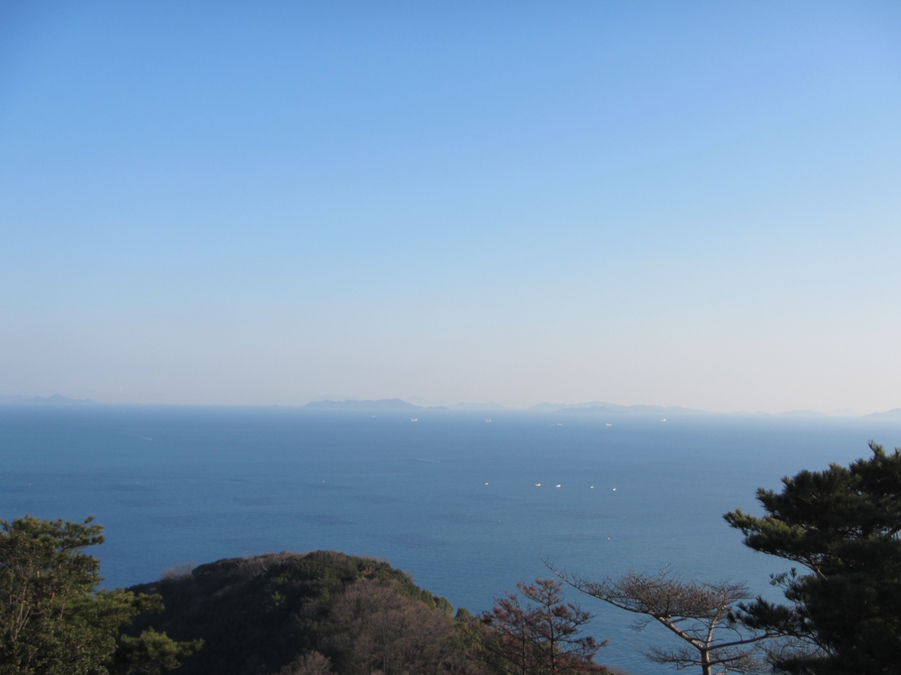 瀬戸内の孤島 魚島の真ん中の一番高いところにある展望台です。ということで、景色は抜群に良いです。ただし、ここに行くには、かなりの体力と根性が必要です。標高147mですので、単純に147m登る必要があります。途中の神社のところまでは、島内一周道路がありますが、仮にそこまで、島の人に車で送ってもらっても、そこは、標高50m程度のところですから、滑りやすい細い山道を100m登る必要があります。展望台自体は電波塔でその途中まで上がれます。景色は抜群です。