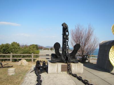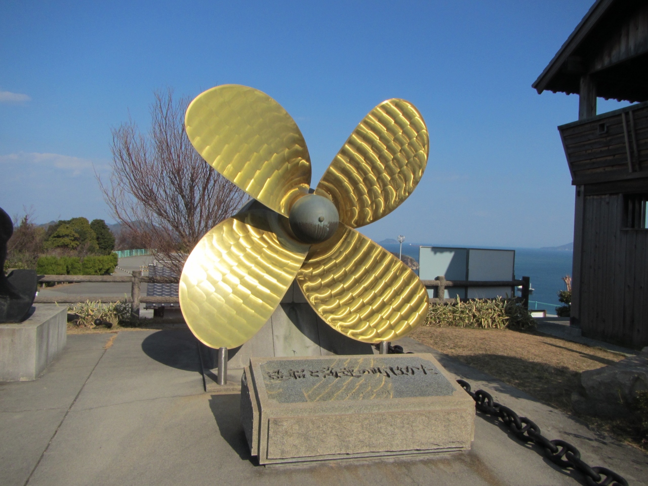 正式名称は、今治市伯方ふるさと歴史公園です。伯方島木浦港の近くの高台にあります。距離的には近くですが、造船所の横をぐるっと回って行く道しかありませんので、港から歩くと、登りで20分程度かかるでしょう。船の巨大スクリューや錨が置いてあります。眼下には、造船所と港が見えます。遠くは、瀬戸の島々が見えて景色は抜群です。