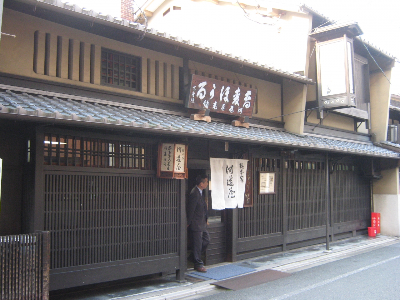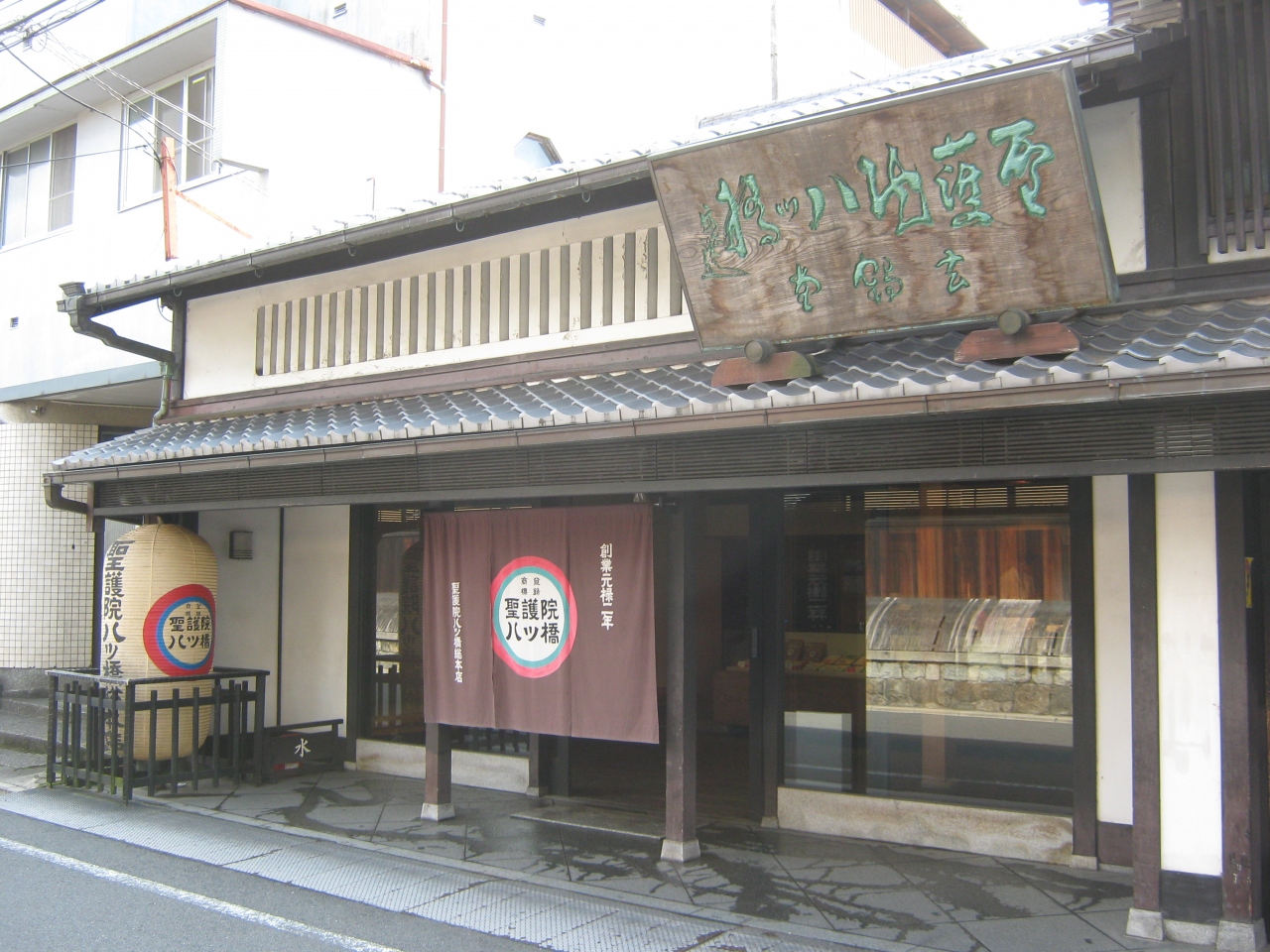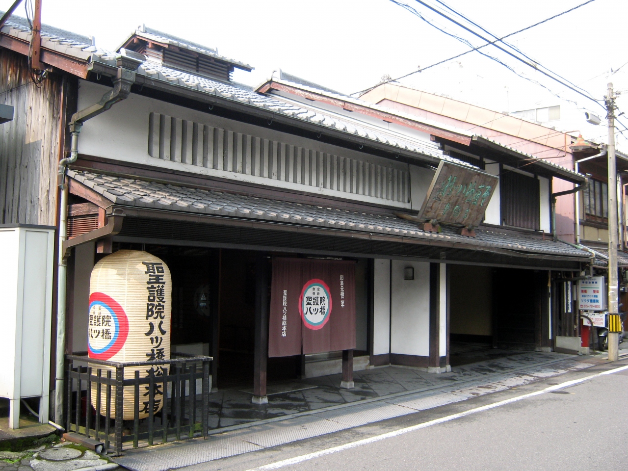 京都大学付属病院の近く、聖護院山王町は、八つ橋の総本家がいっぱいです。ただ、注意しなければならないのは、熊野交差点にあるお店は、総本店ではないことです。総本店は少し、北に行って、東に入ったところにあります。近くの西尾八つ橋総本店は、八つ橋発祥の家の提灯をぶら下げています。