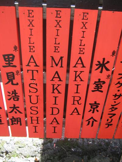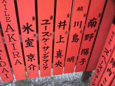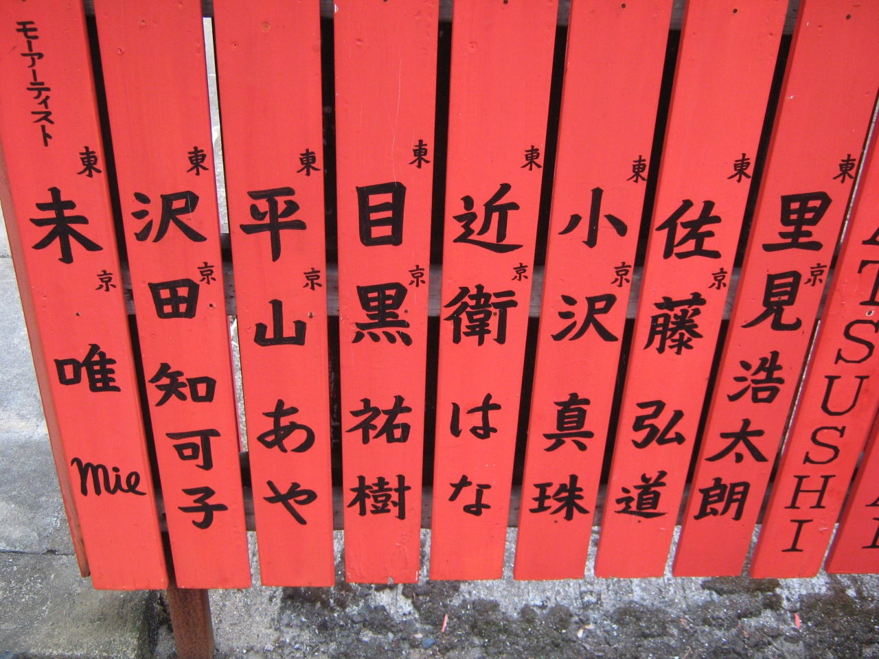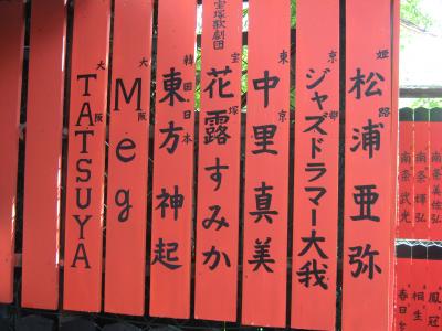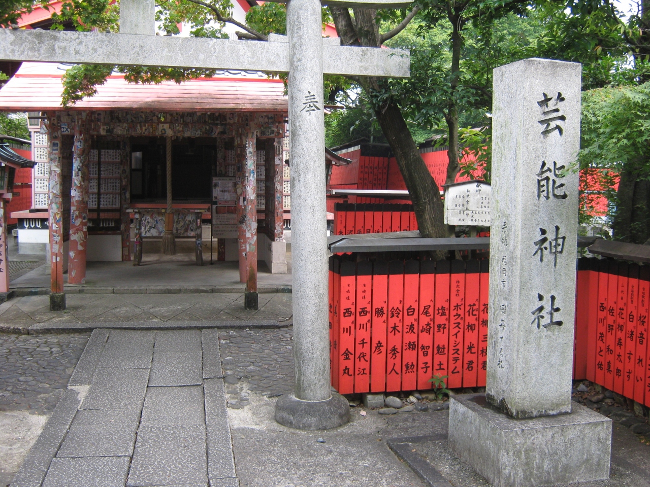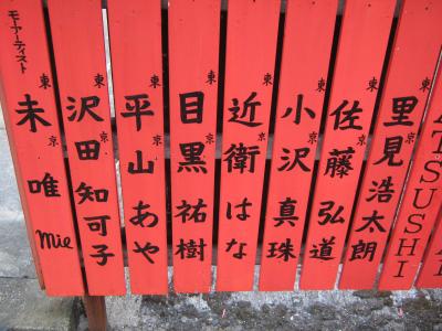 芸能神社は車折神社の中にあります。嵐電の車折神社前下車ですと、車折神社を通り抜けたところにあります。歴史的・文化財的価値のあるものはありませんが、芸能人が奉納した赤いお札がいっぱいあります。知っている芸能人・好きな芸能人のお札を探してみるのが楽しみです。誰のお札があるかは、写真を参照してください。