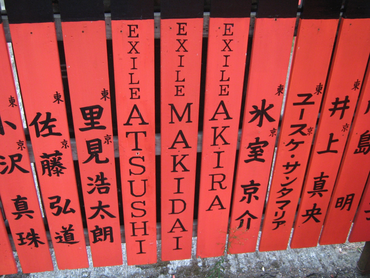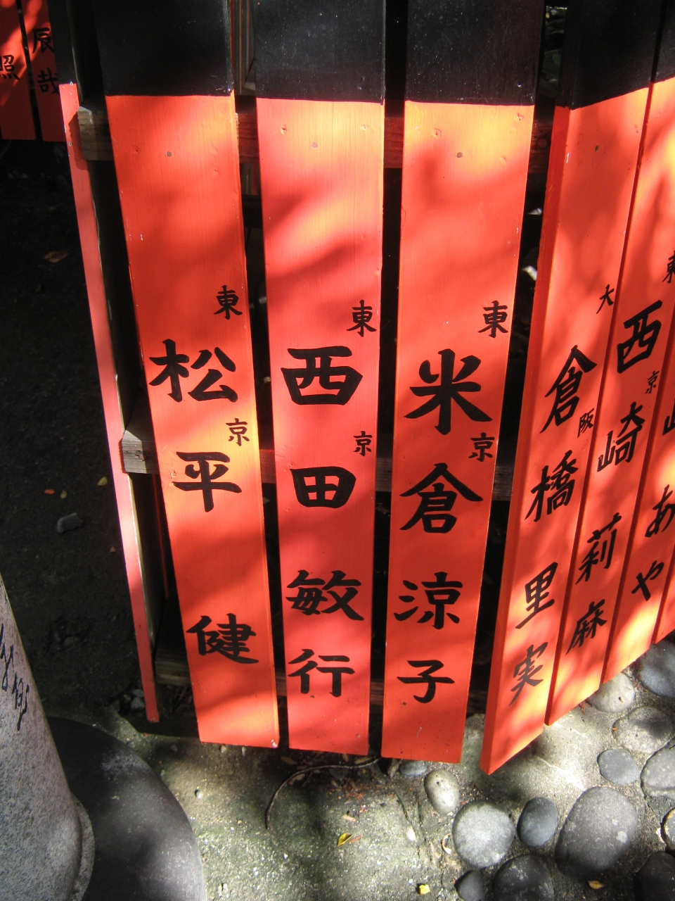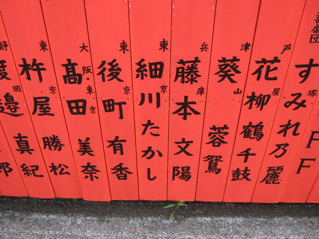 芸能神社は車折神社の中にあります。嵐電の車折神社前下車ですと、車折神社を通り抜けたところにあります。歴史的・文化財的価値のあるものはありませんが、芸能人が奉納した赤いお札がいっぱいあります。知っている芸能人・好きな芸能人のお札を探してみるのが楽しみです。誰のお札があるかは、写真を参照してください。