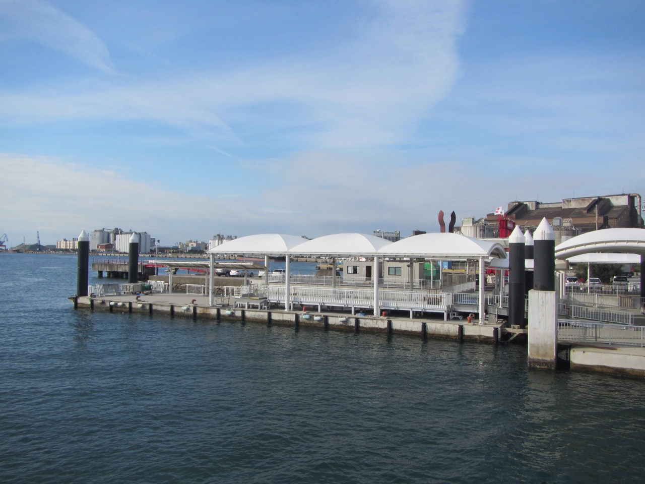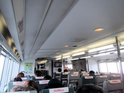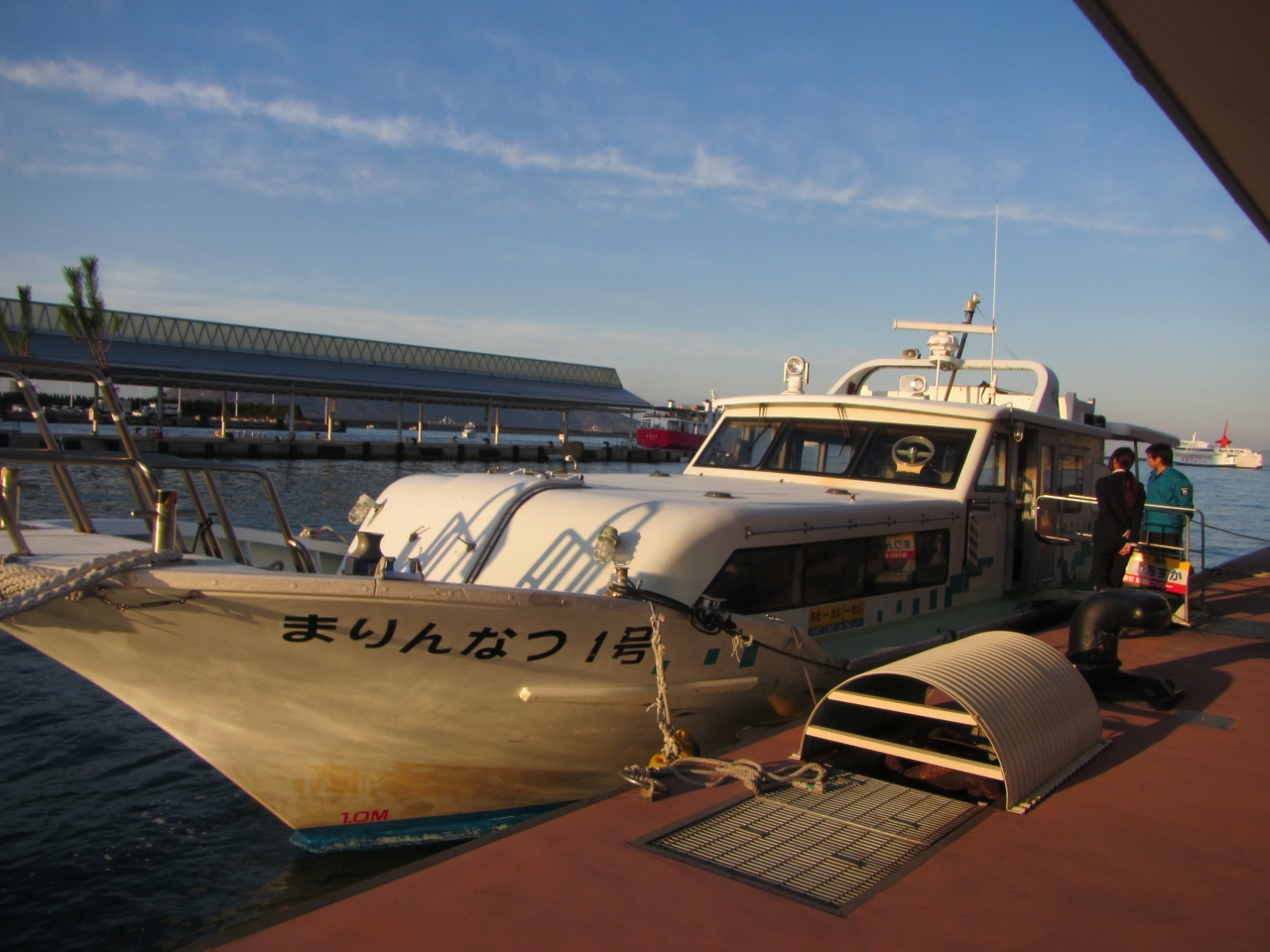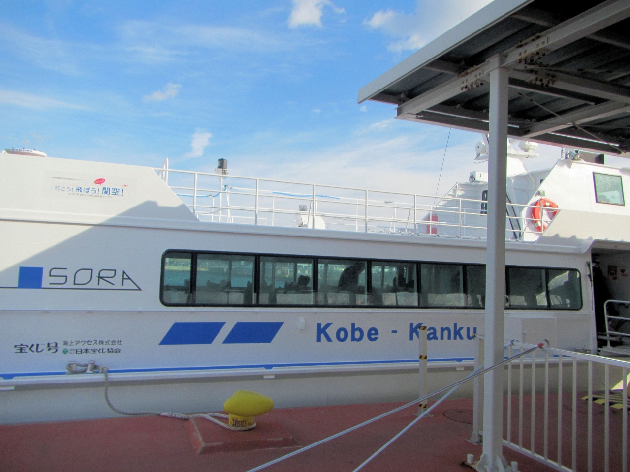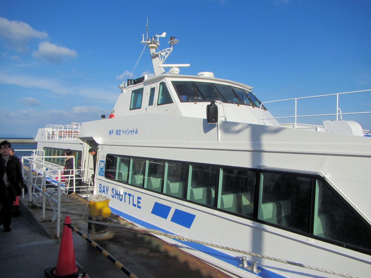 関空と神戸空港を結ぶベイ シャトル。高速艇です。基本は、トイレ以外座席に座ったままです。外に出ることは出来ませんし、窓に波がかかったりしますので、景色を楽しむことは出来ません。神戸空港では、空港駅を降りたところから、船乗り場までバスが出ていますが、歩いても3分程度です。関空の方は、歩いては行けません。船の時刻にあわせて、バスが出てますので、きっちりそれに乗る必要があります。乗船者は、神戸空港の駐車場使用料が無料になりますので、車利用者が多いみたいです。