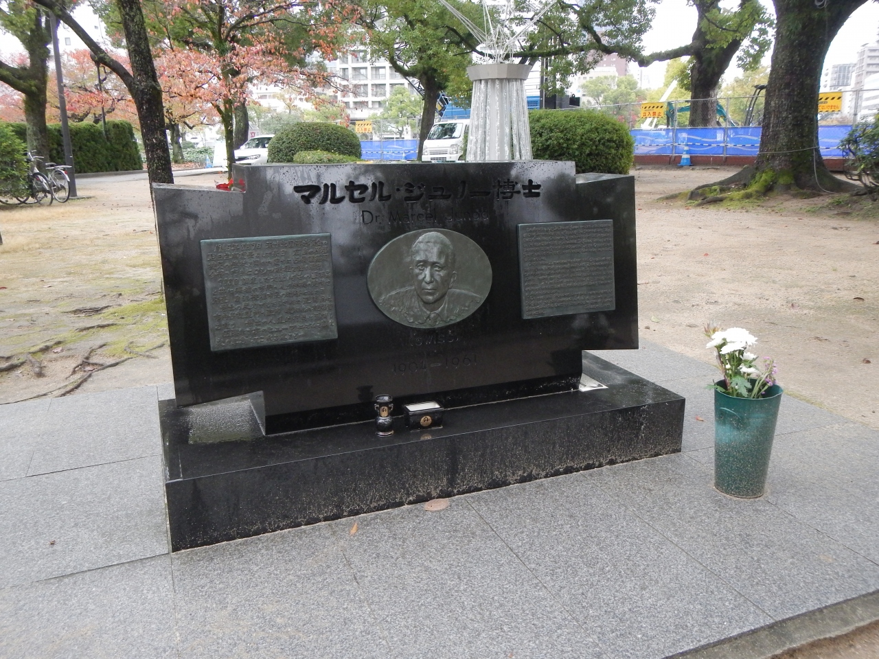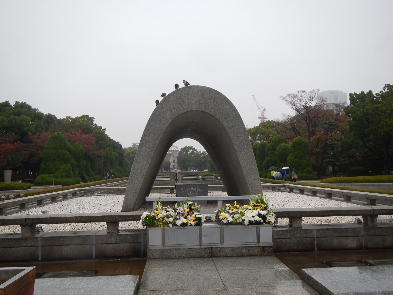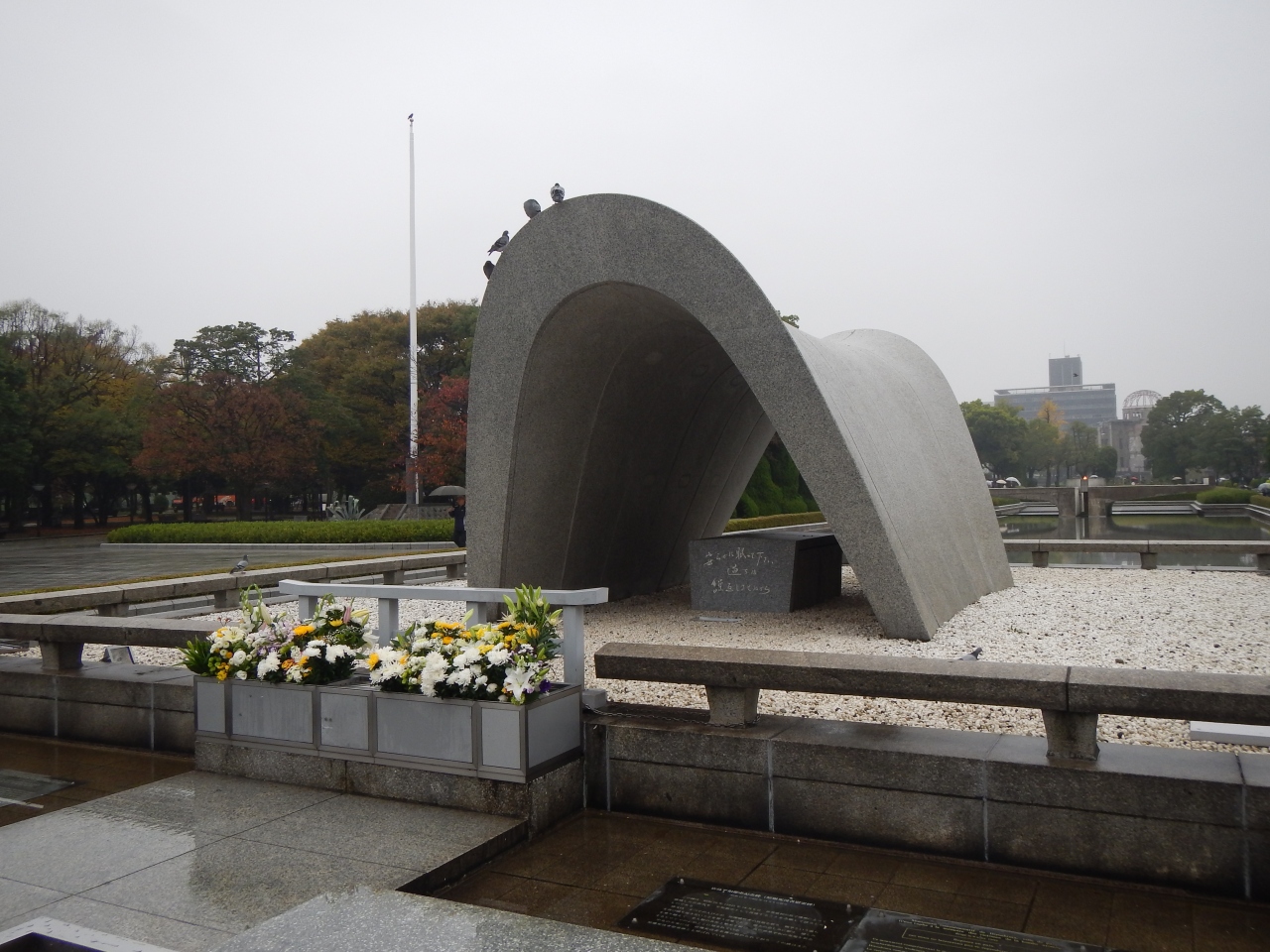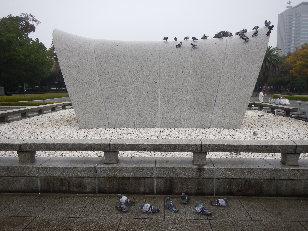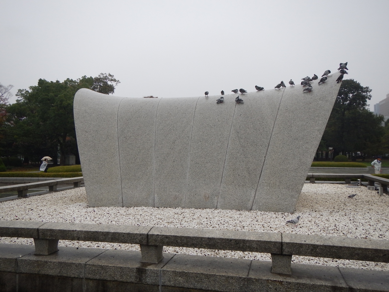 2015年11月いつも、たくさんの花束が捧げられていますが、この近くに花屋さんはありません。なぜか、たくさんの鳩が碑の上に止まっていました(写真)