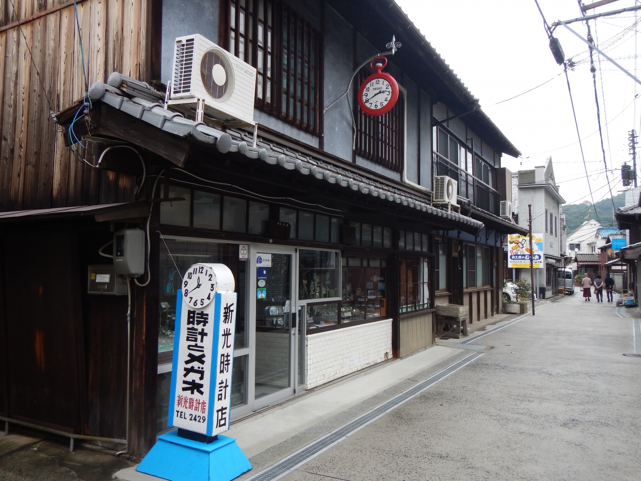【要注意】2015年11月時計屋さんですが、店頭の赤い掛け時計も青と白の看板時計も時刻はあっていません。写真は12時45分頃に撮ったものです。時計屋さんですから、観光施設ではありません。店の名前は、松浦時計店では無く、新光時計店です(写真参照)