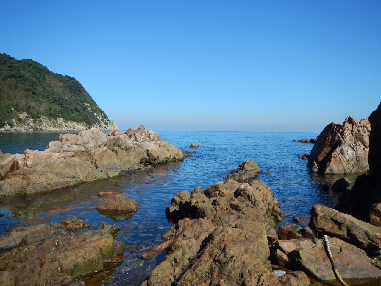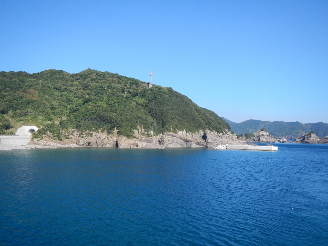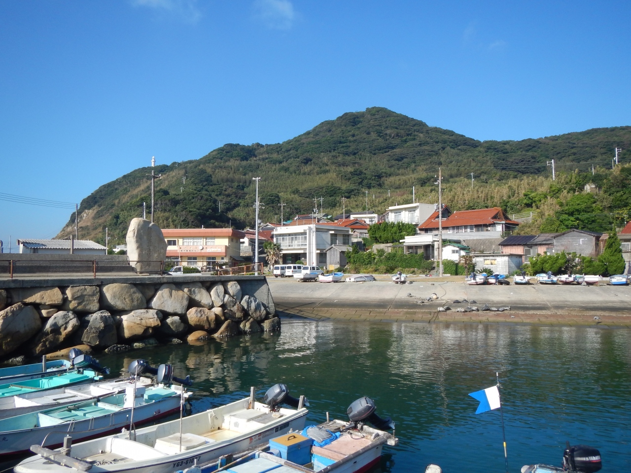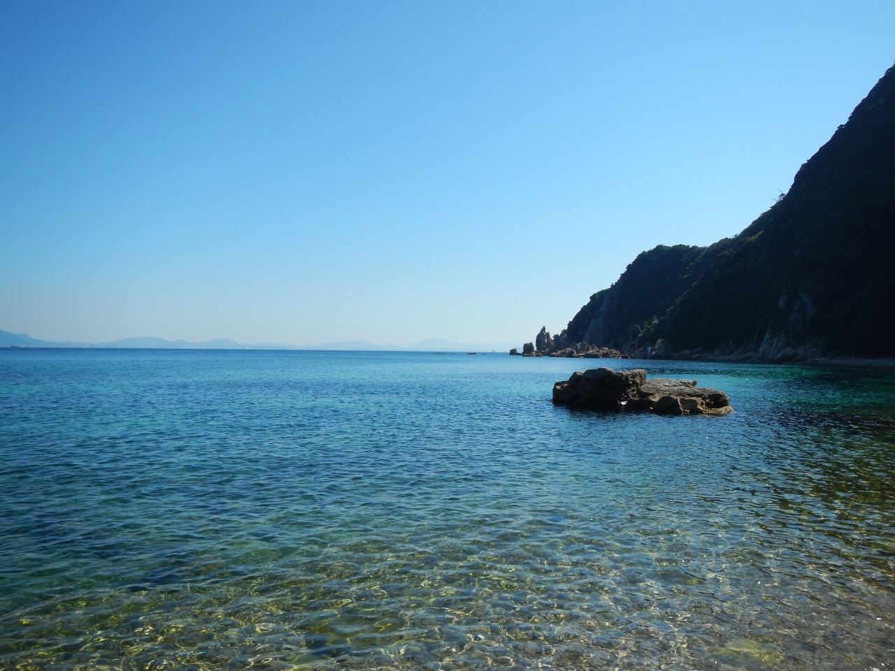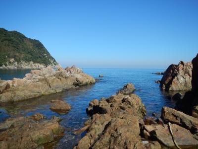 【2015年10月】山口県日本海の孤島 蓋井島の向浜。島の東の端の浜です。対岸の本土側が正面に見えます。