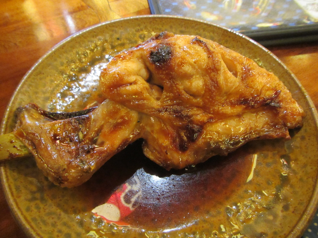 山賊焼きは鳥のモモ焼きに甘ったるい醤油たれです。うどんは太いうどんです。