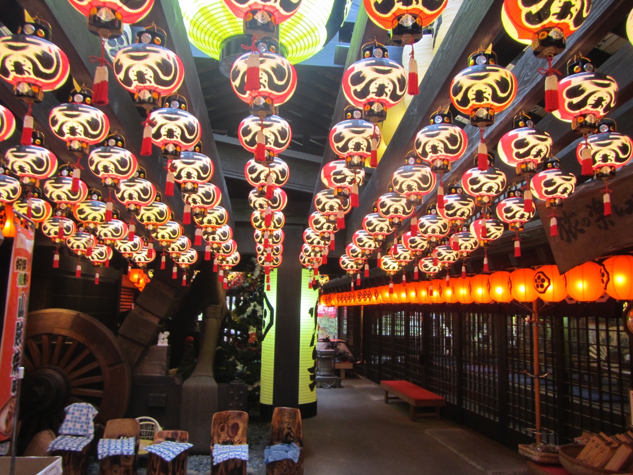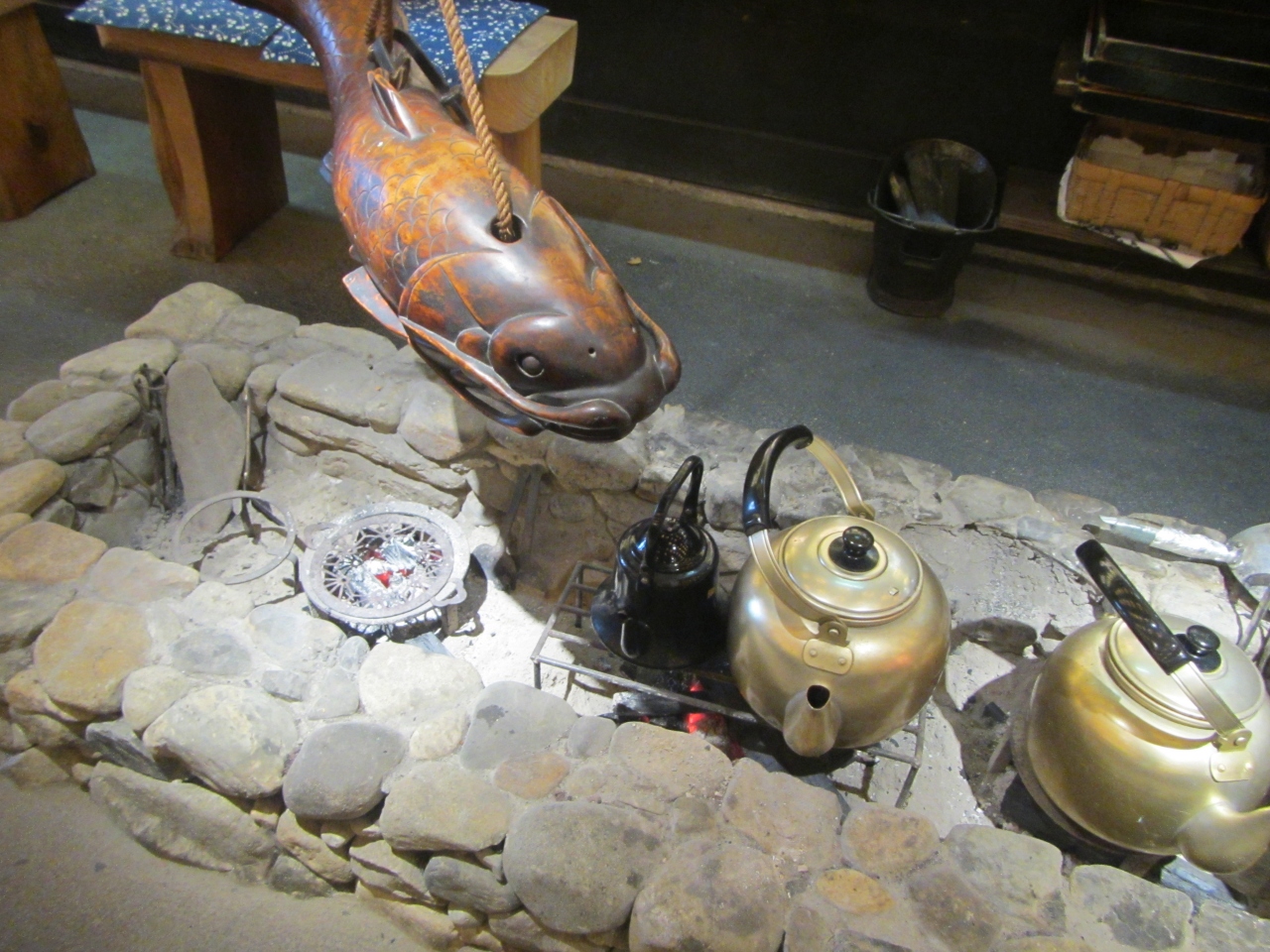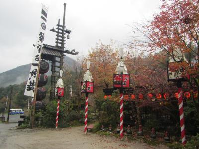 2015年11月、雨の平日の昼。混んでませんでした。掘りごたつ席有り。土産物店有り。足湯有り。いろり有り。