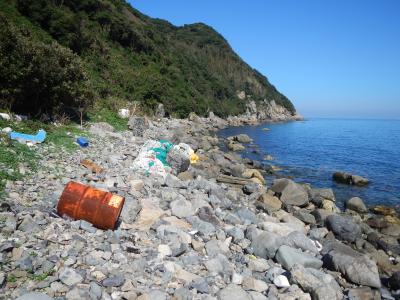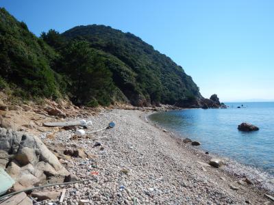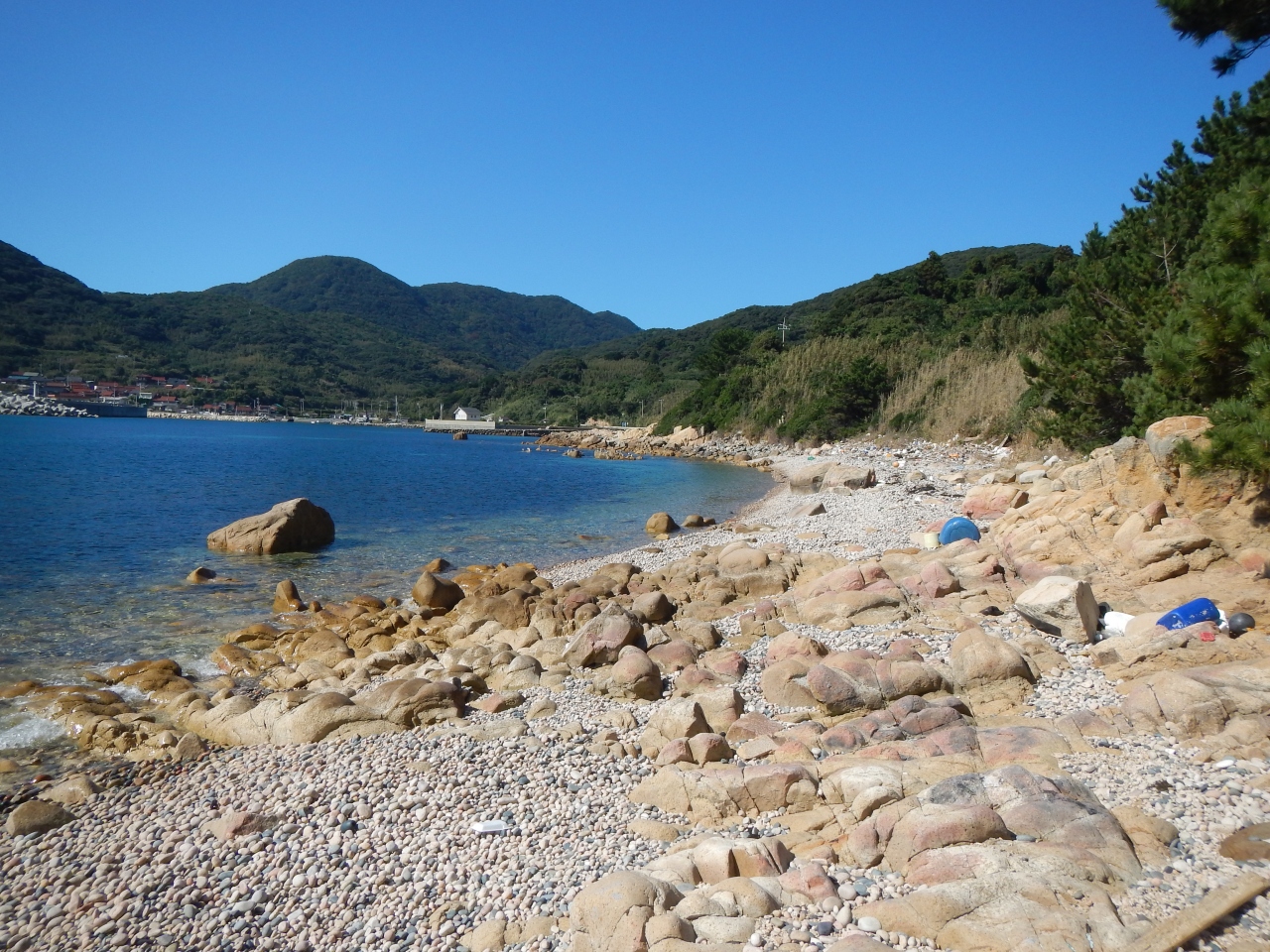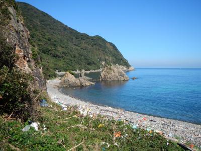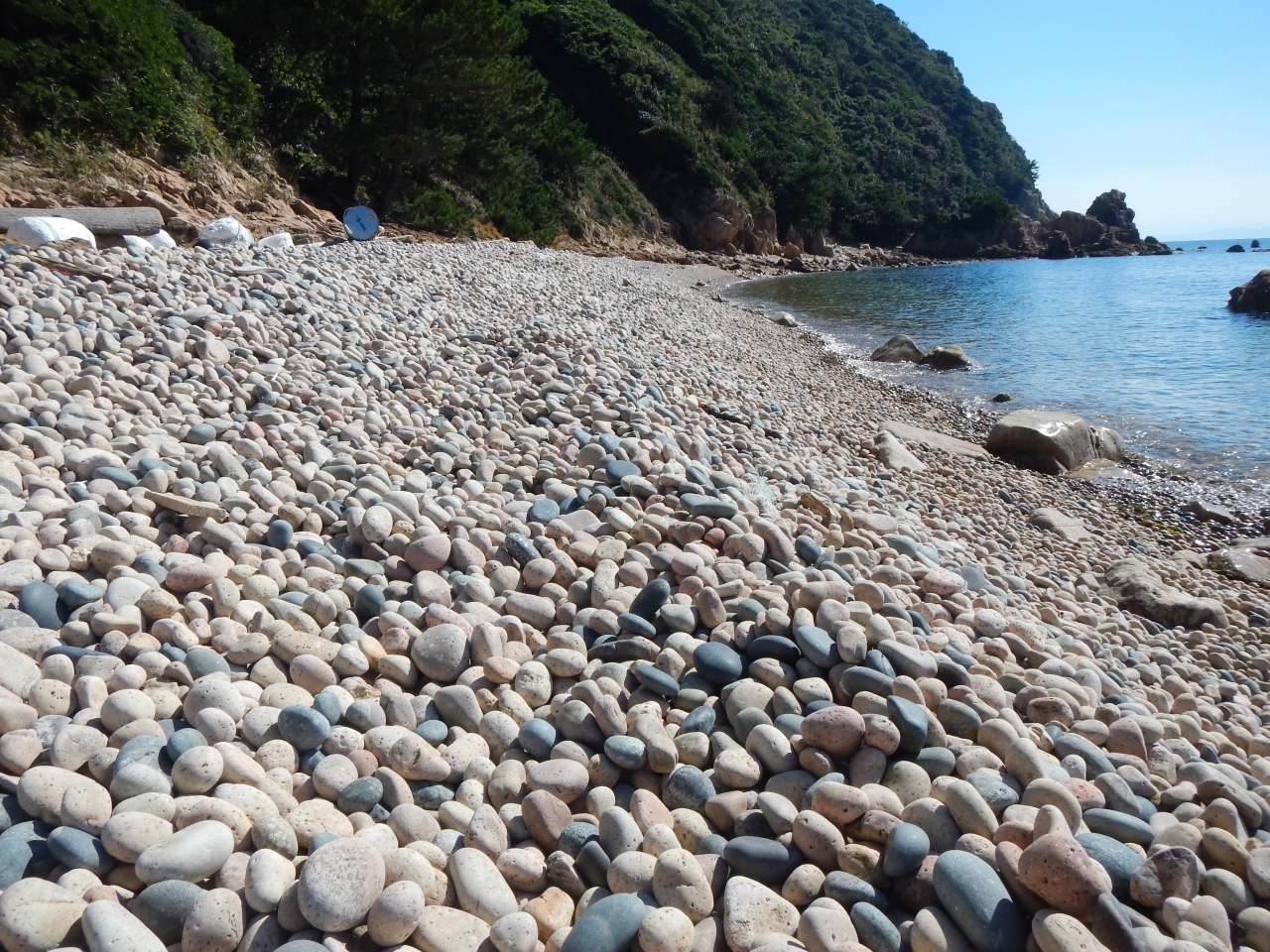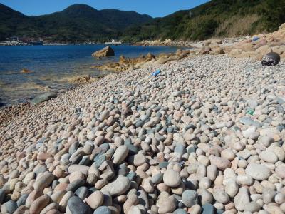 【2015年10月】山口県日本海の孤島 蓋井島の鱶井湾 砂浜では無く丸い石のきれいな浜ですが、残念ながら漂流ゴミがいっぱいでした