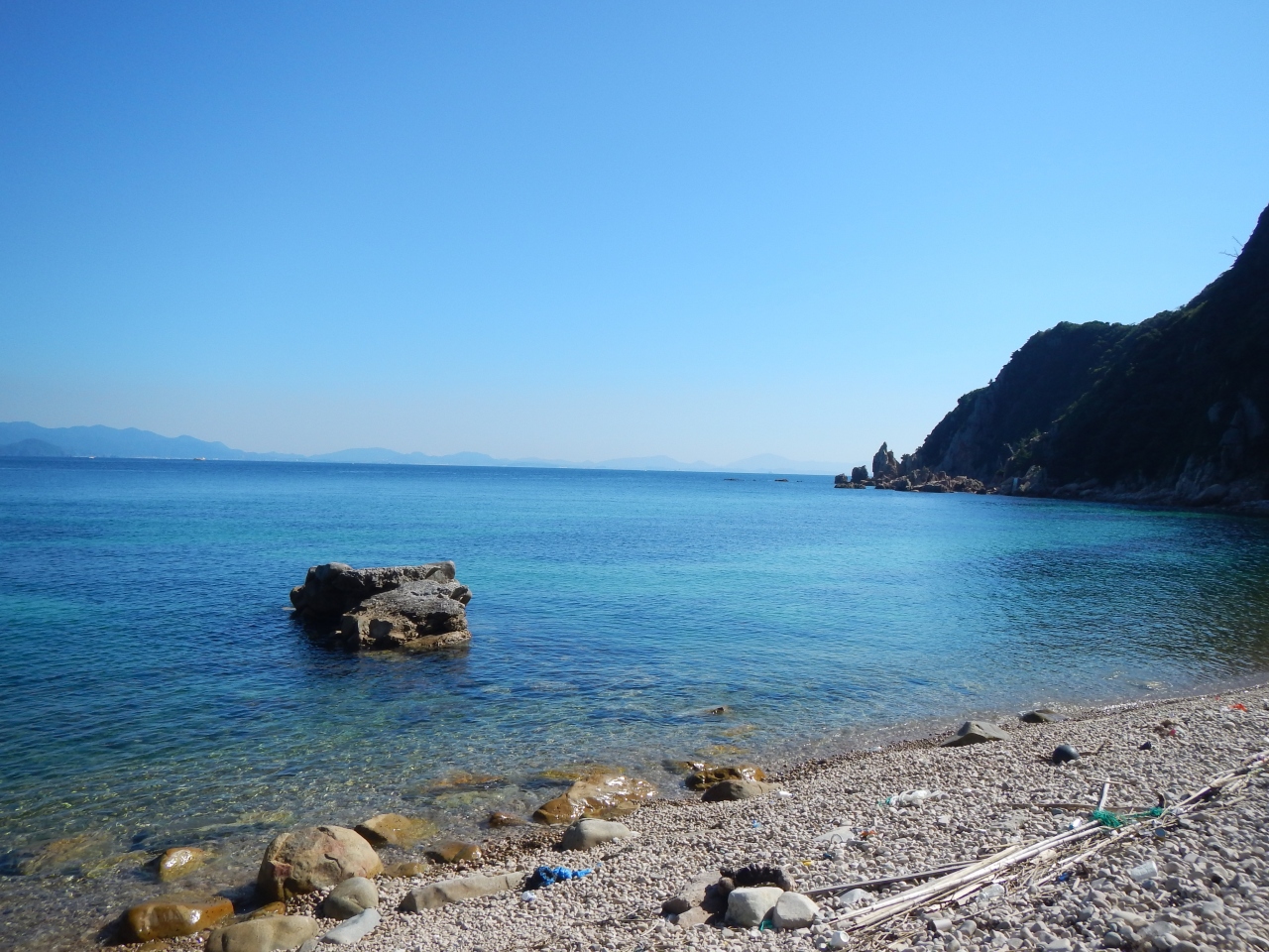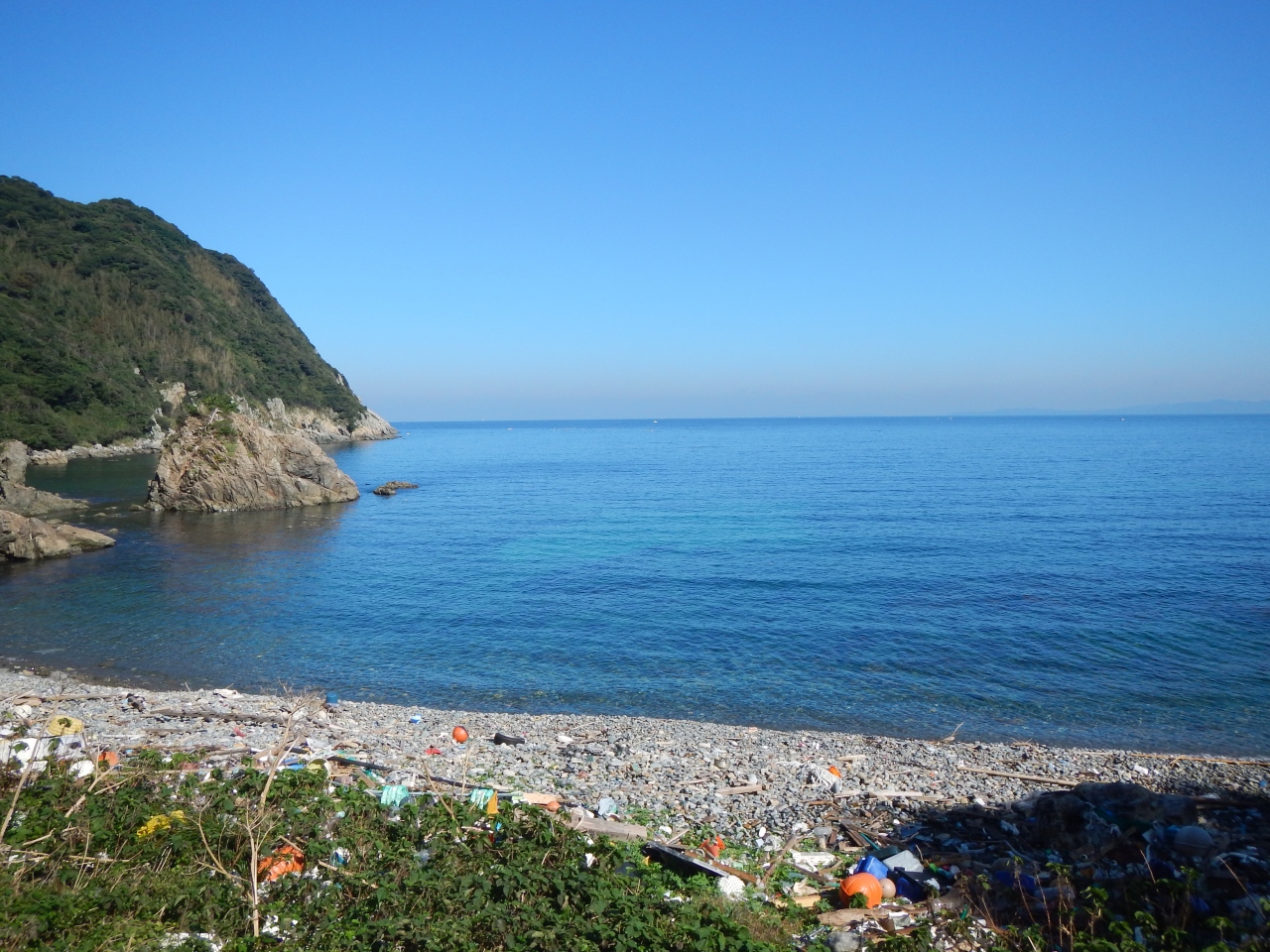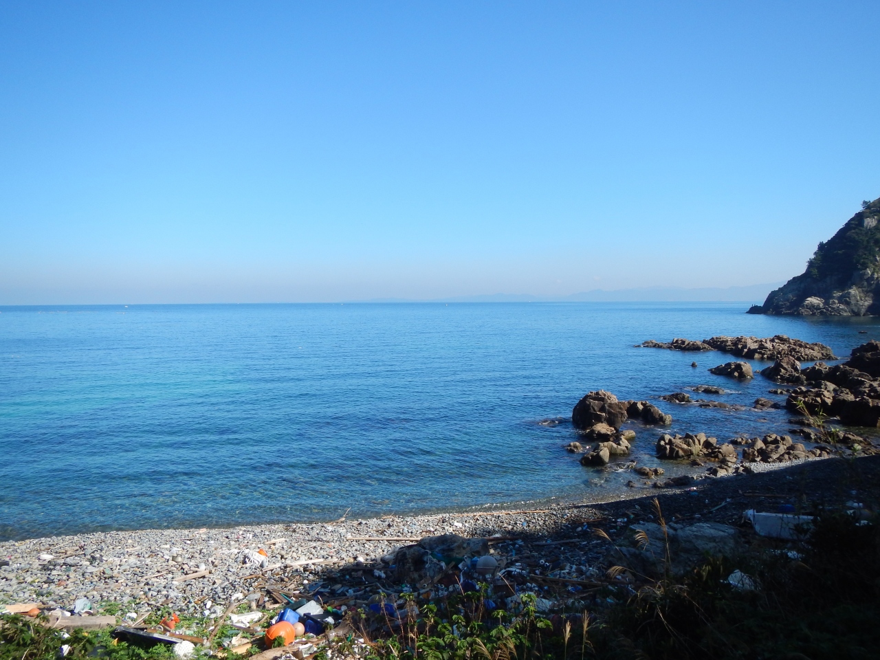 【2015年10月】山口県日本海の孤島 蓋井島の鱶井湾 砂浜では無く丸い石のきれいな浜ですが、残念ながら漂流ゴミがいっぱいでした
