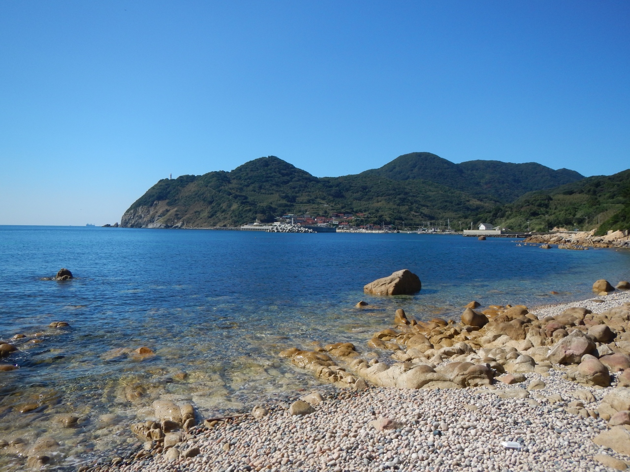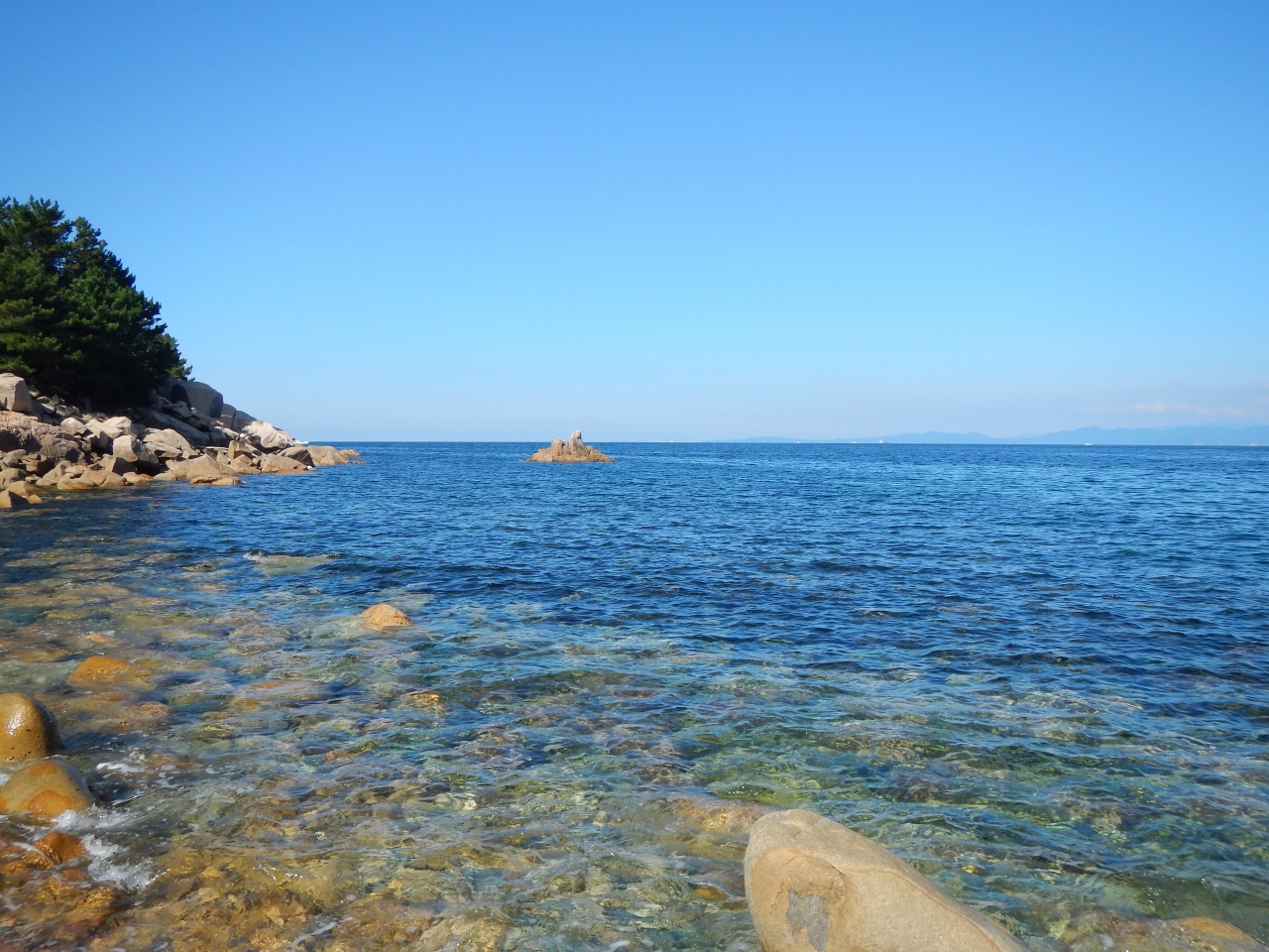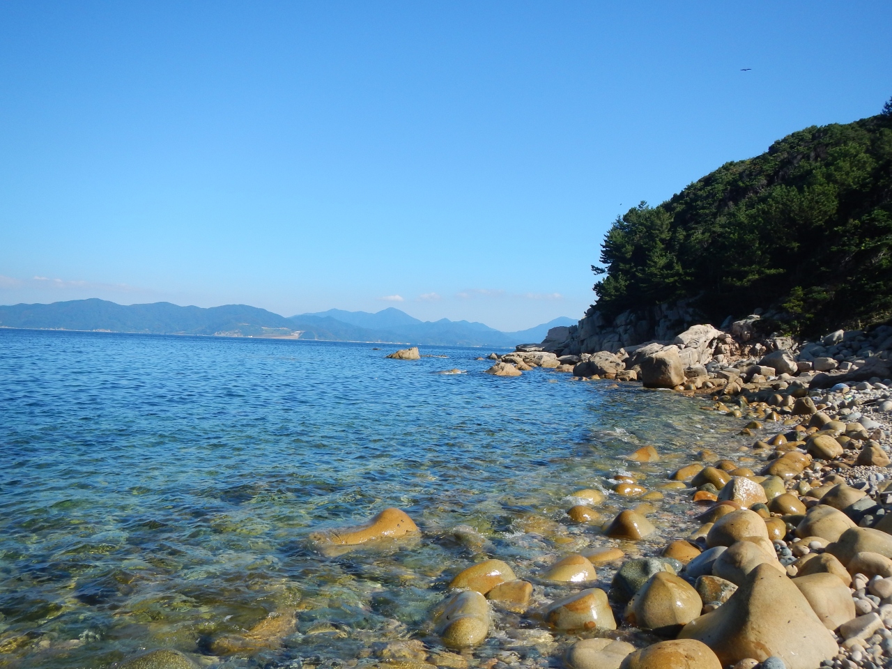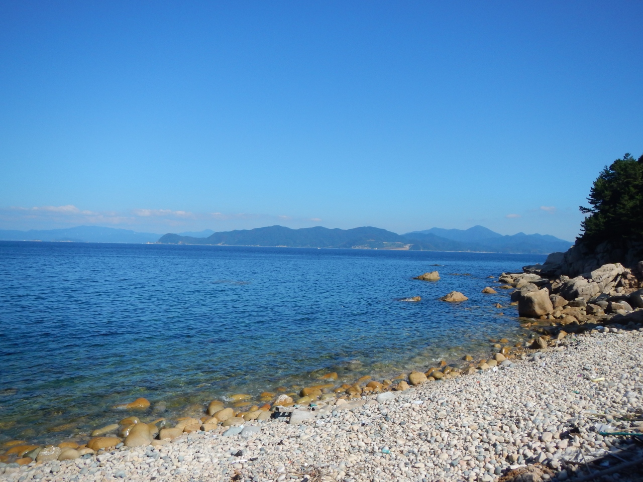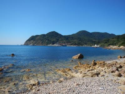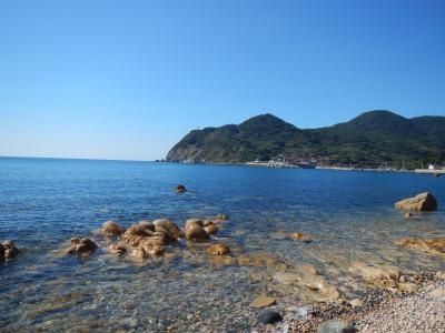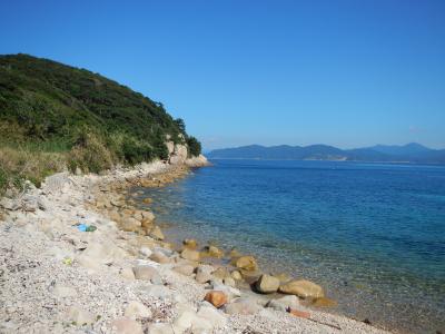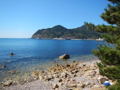 【2015年10月】山口県日本海の孤島 蓋井島の貴船浜。海は、これが日本海の碧 と言う感じできれいでした。透明度も高いです。浜は砂浜では無く、丸い石がごろごろ転がっています。