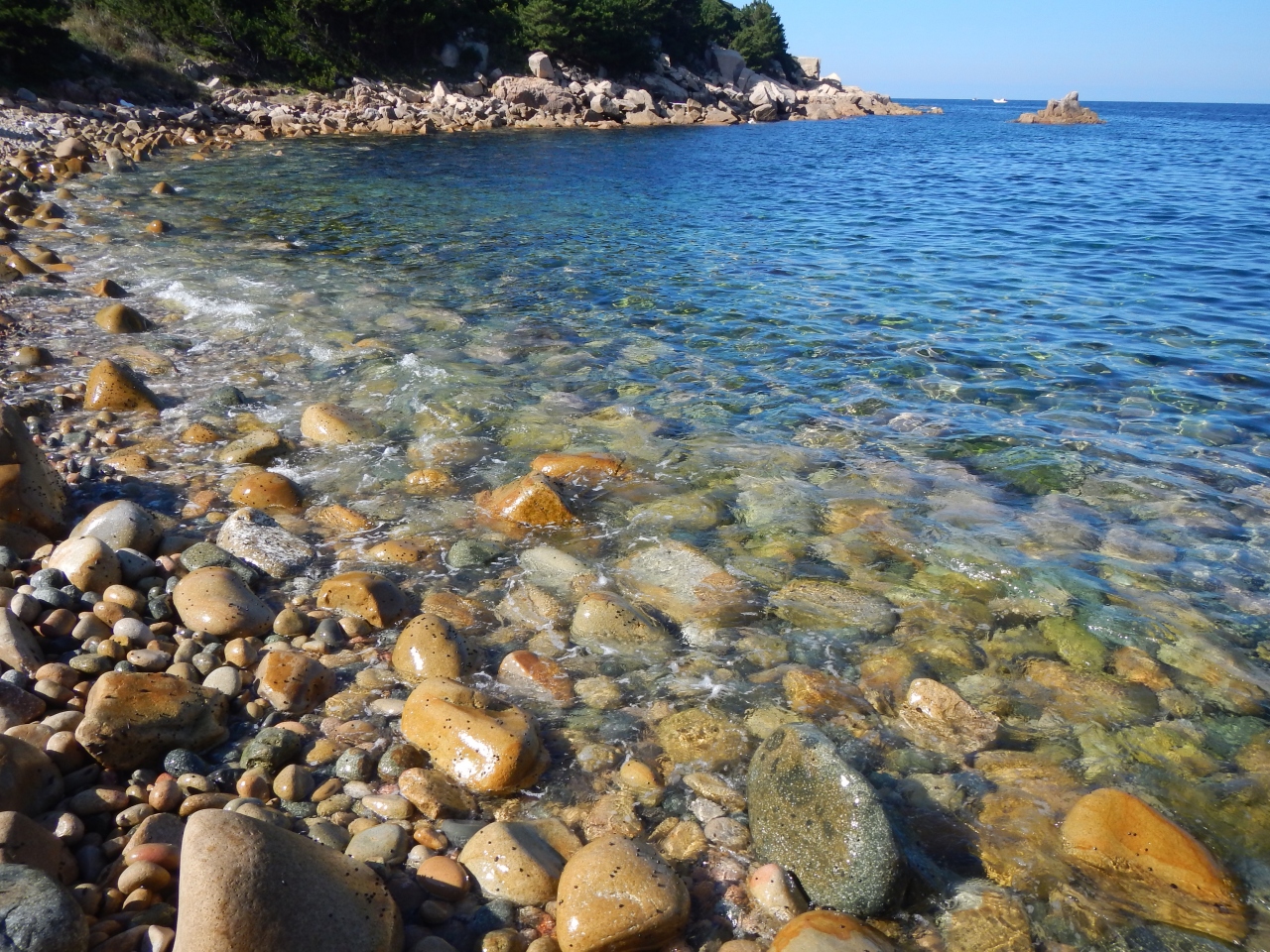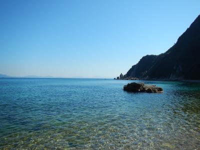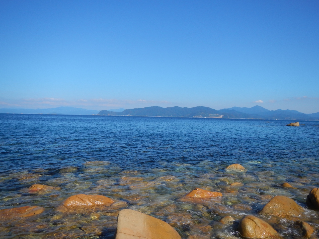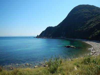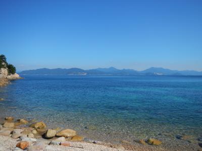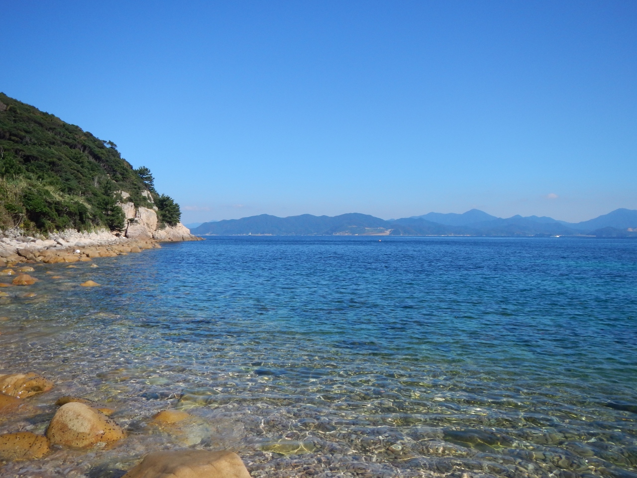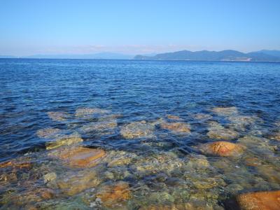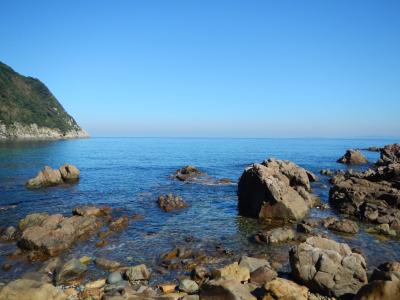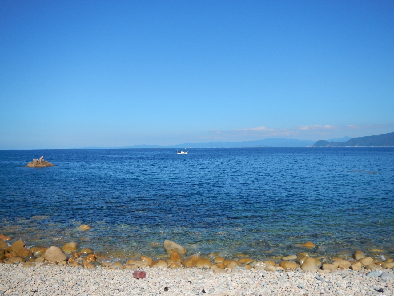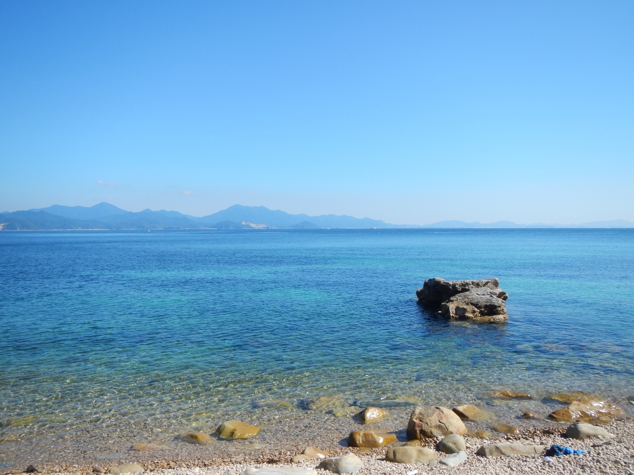 【2015年10月】山口県日本海の孤島 蓋井島の貴船浜。海は、これが日本海の碧 と言う感じできれいでした。透明度も高いです。浜は砂浜では無く、丸い石がごろごろ転がっています。