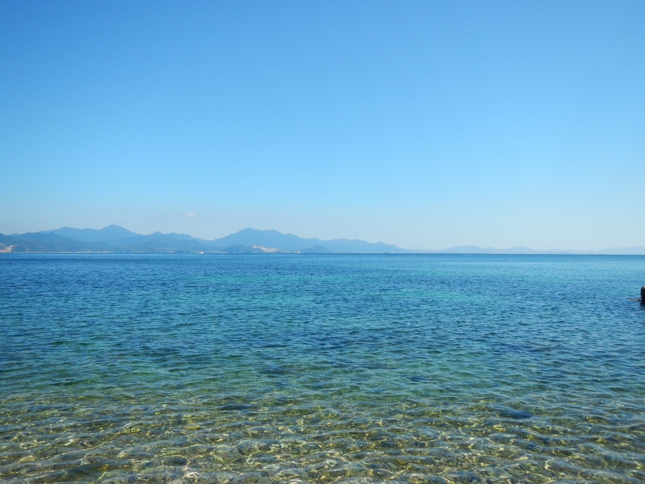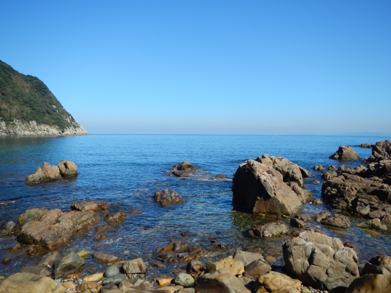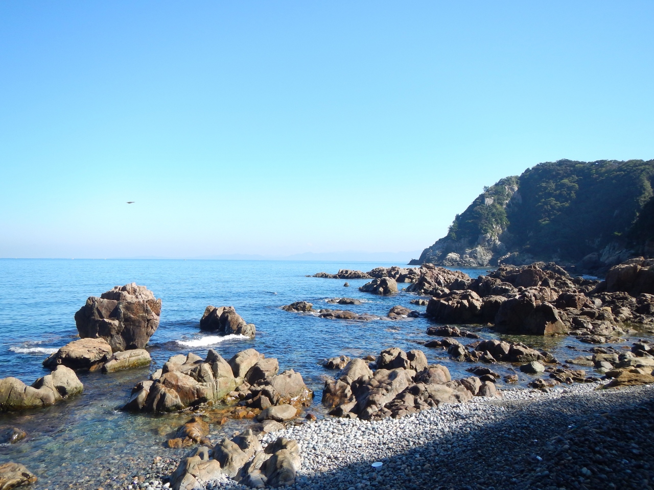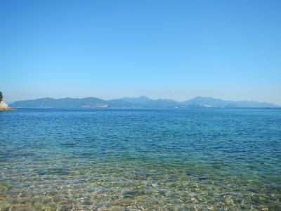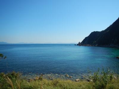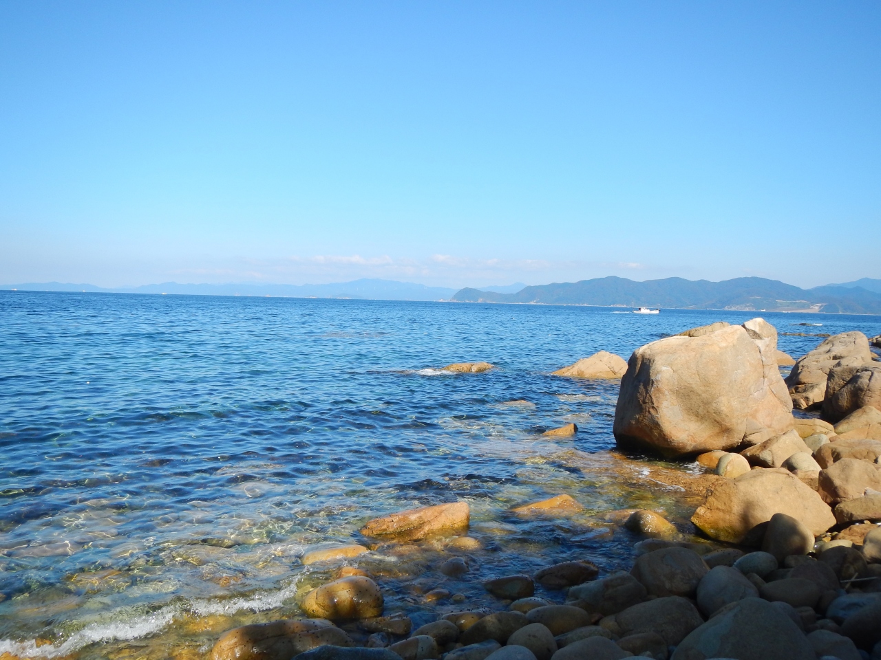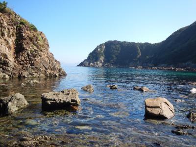 【2015年10月】山口県日本海の孤島 蓋井島の貴船浜。海は、これが日本海の碧 と言う感じできれいでした。透明度も高いです。浜は砂浜では無く、丸い石がごろごろ転がっています。