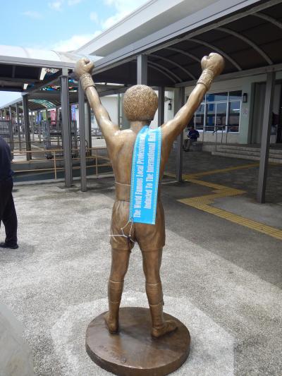 2015年4月末、世界ボクシング殿堂入りのたすきが掛かってました。このたすきの裏面はなんと、英語で書かれています。また、昨年は無かったはずの、説明板(白い大理石制製の豪華版)が設置されていました。