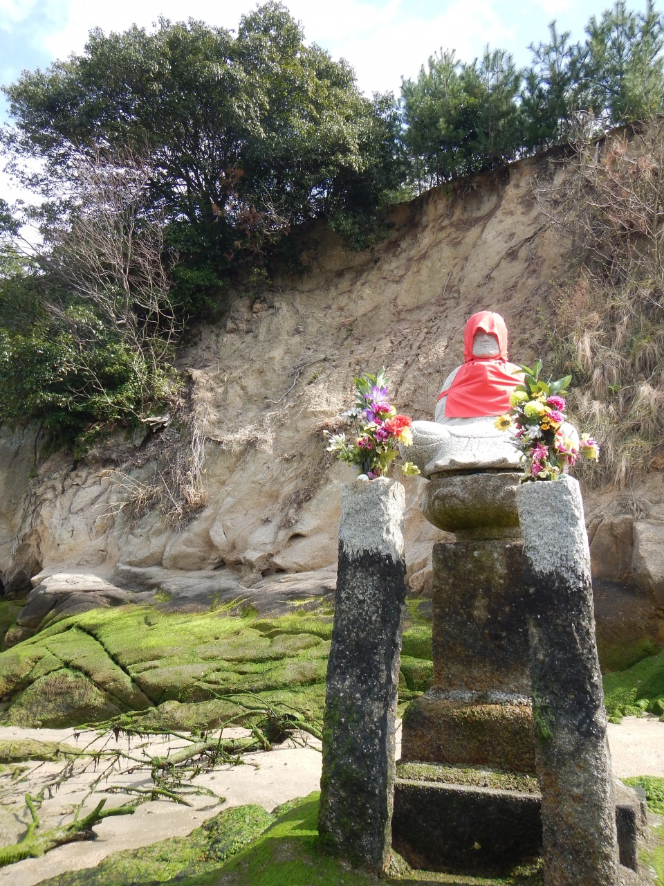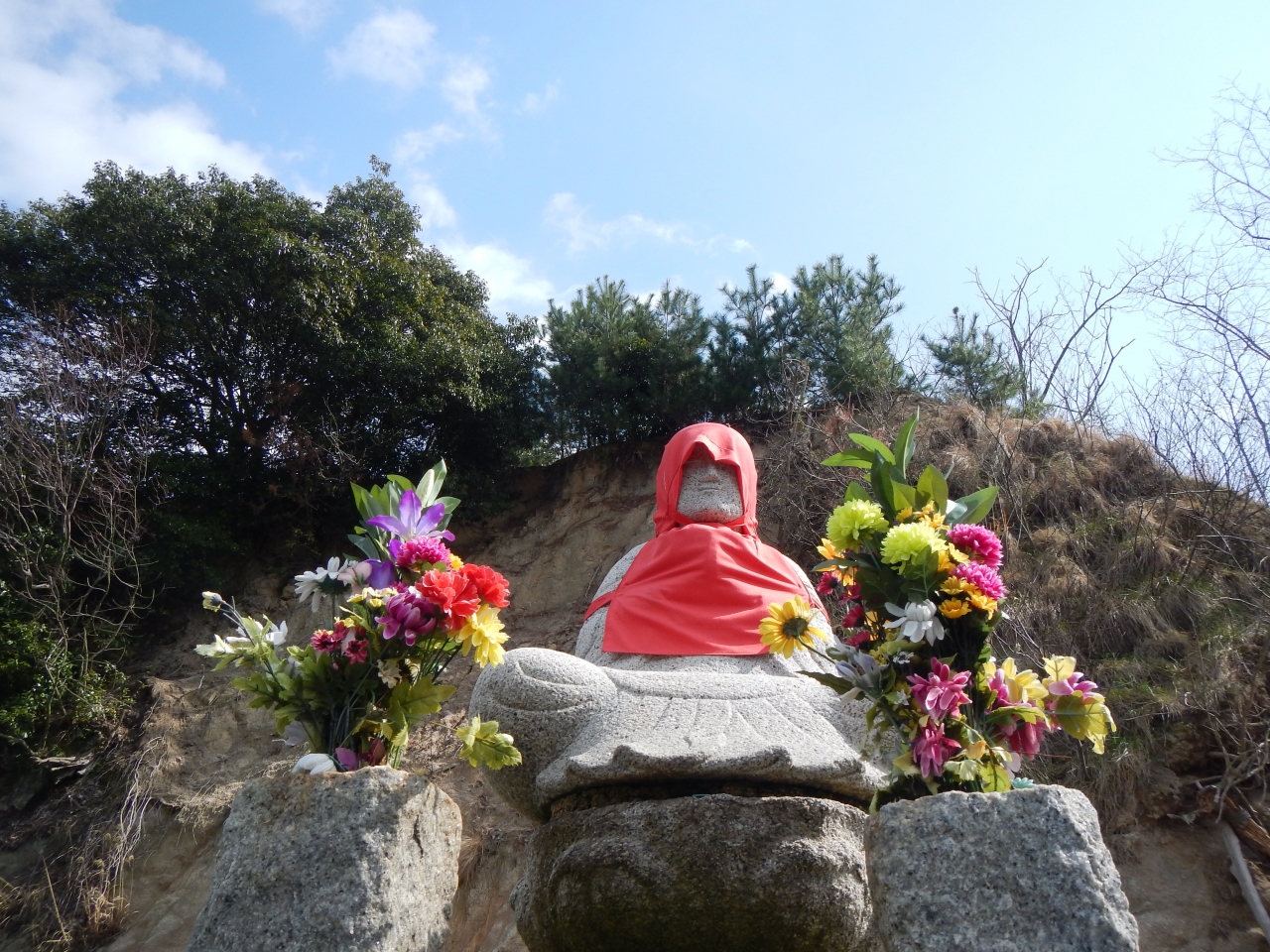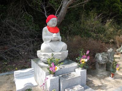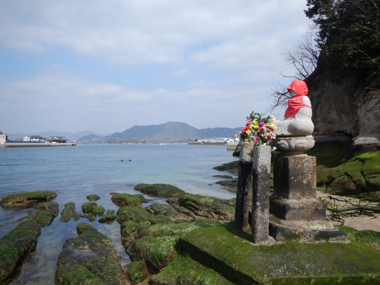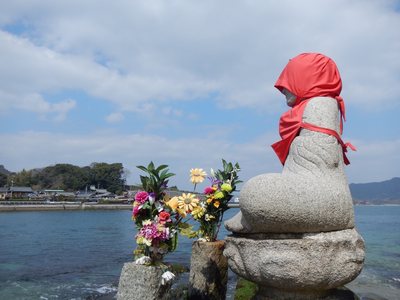 2015年3月赤い頭巾と前掛けが可愛かったです。生口島の瀬戸田港から、生口島と高根島との間の黄色い橋の方へ歩き、黄色い橋の下をくぐり、少し行ったところにあります。