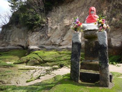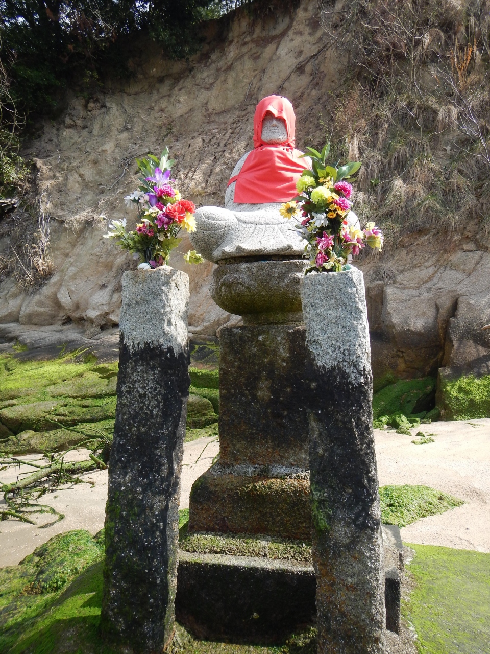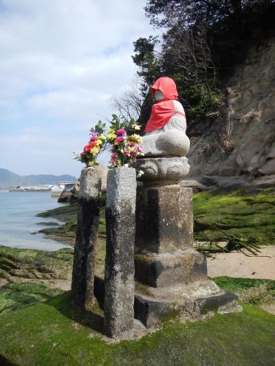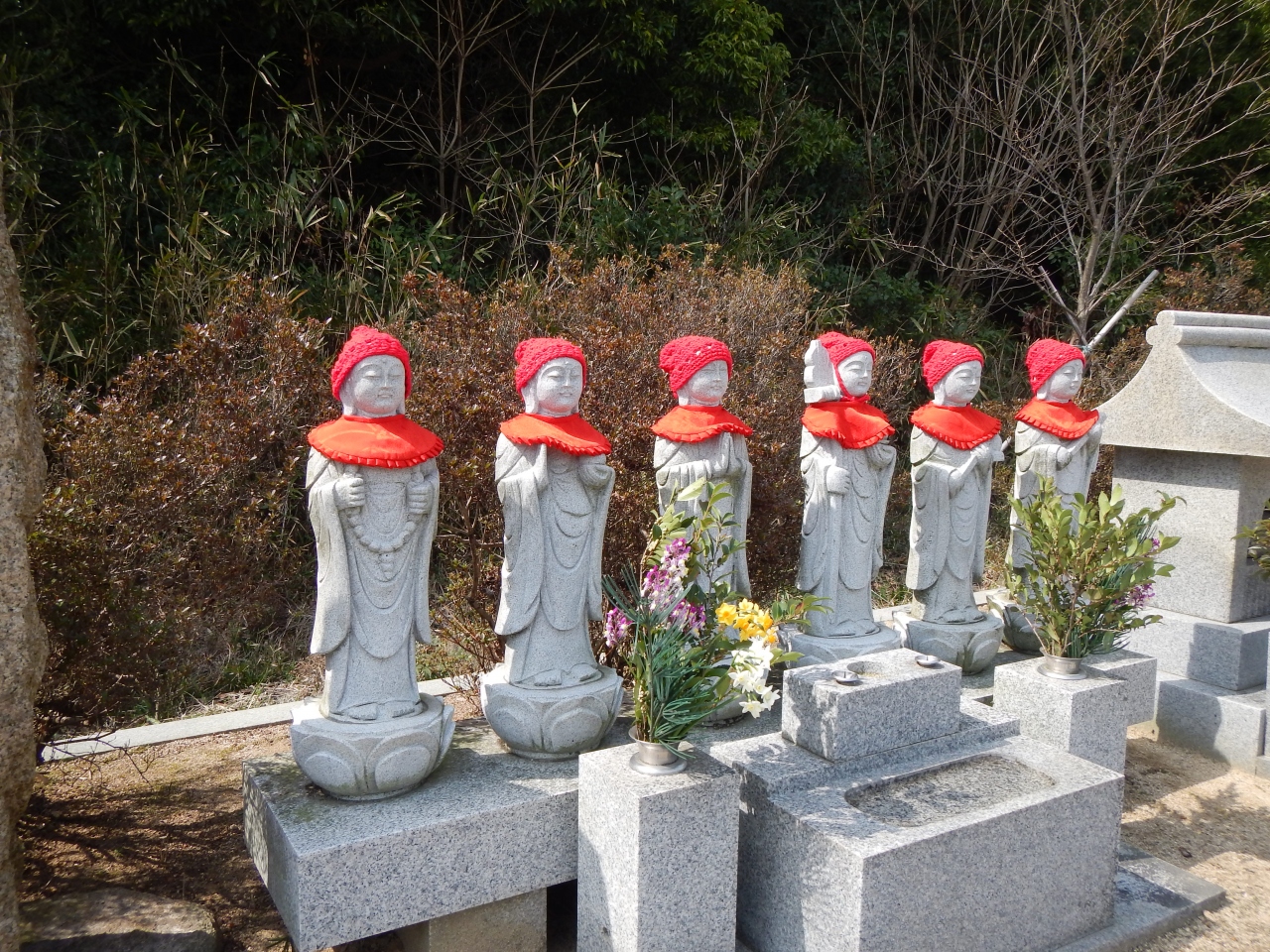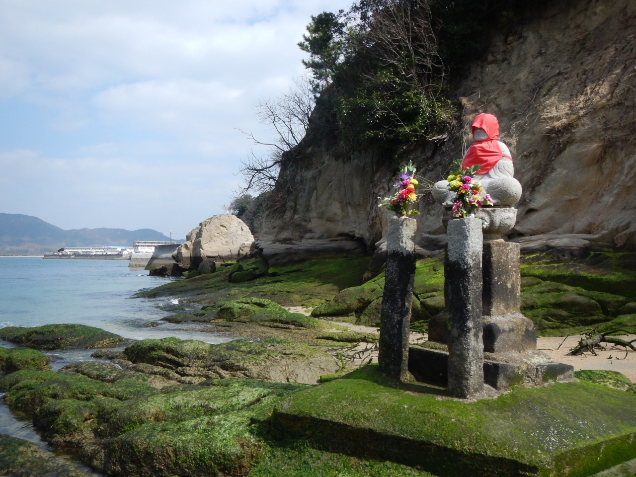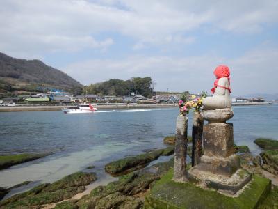 2015年3月赤い頭巾と前掛けが可愛かったです。生口島の瀬戸田港から、生口島と高根島との間の黄色い橋の方へ歩き、黄色い橋の下をくぐり、少し行ったところにあります。