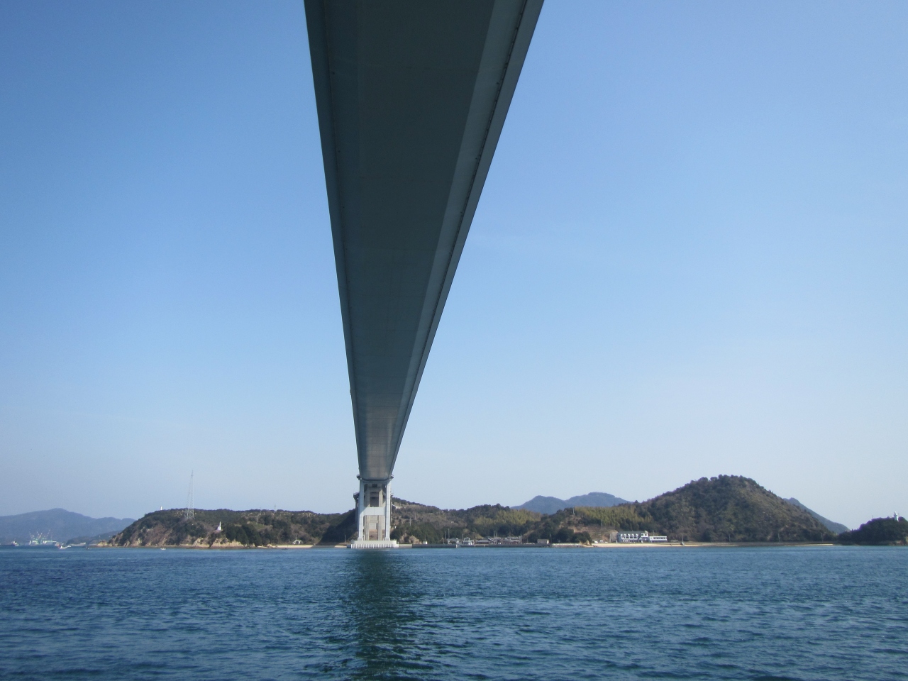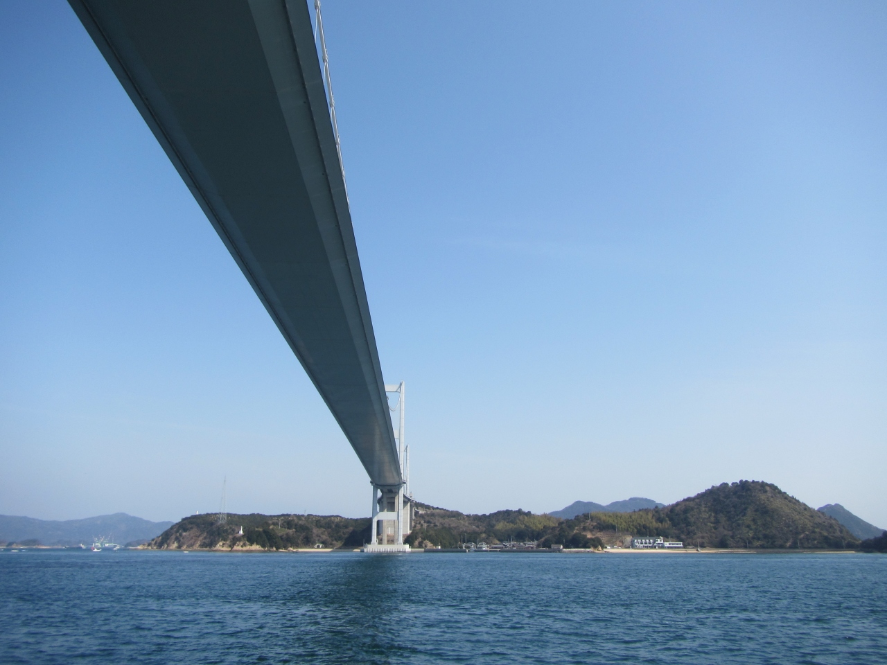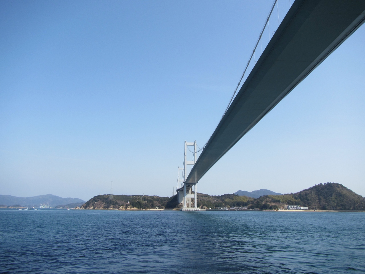 来島海峡大橋をくぐる雄大な景色を眺めることが出来ます。今治港と岡村島を結びます 途中、小大下島・大下島にも寄港します