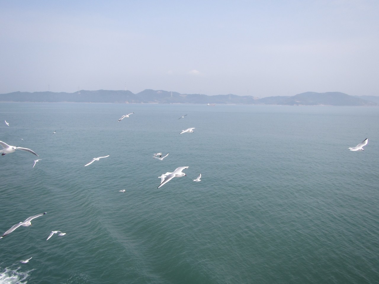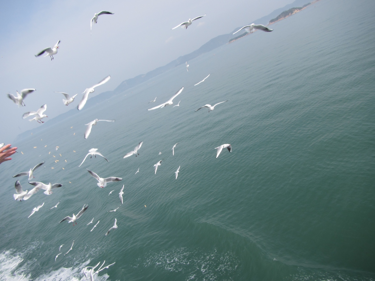これは、乗客がかっぱえびせんでカモメを餌付けしているからです。ジジババがかっぱえびせんを大量に(何袋も)ばらまいています。