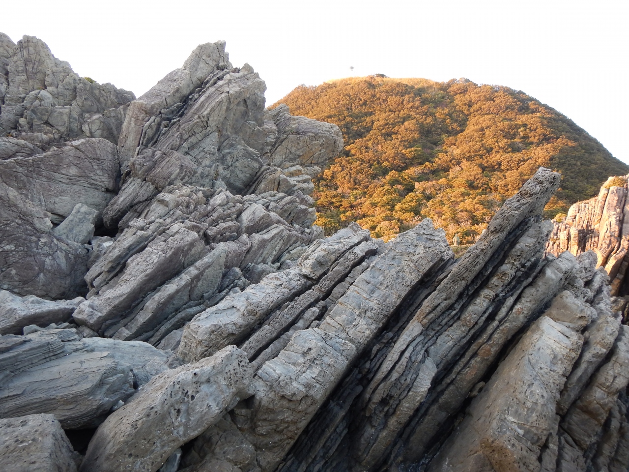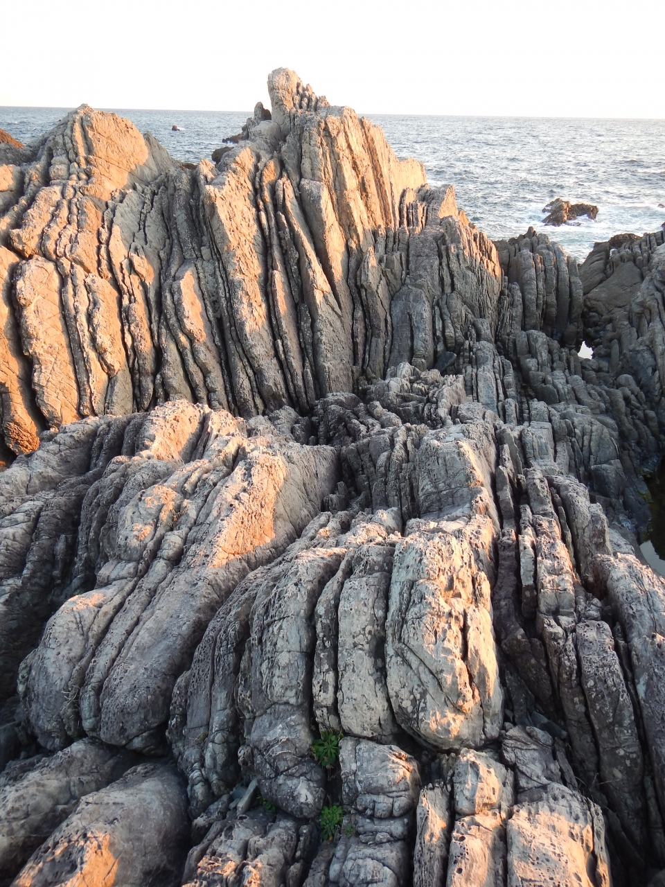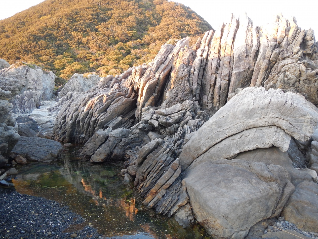 岬の先端部分の岩をよじ登っていくと、地層のすごさがわかります。岩はざらざらでごつごつしているので、足がかりがあり簡単に上り下りできますが、低いところは、満潮時に濡れて、滑りやすくなっているので注意が必要です。