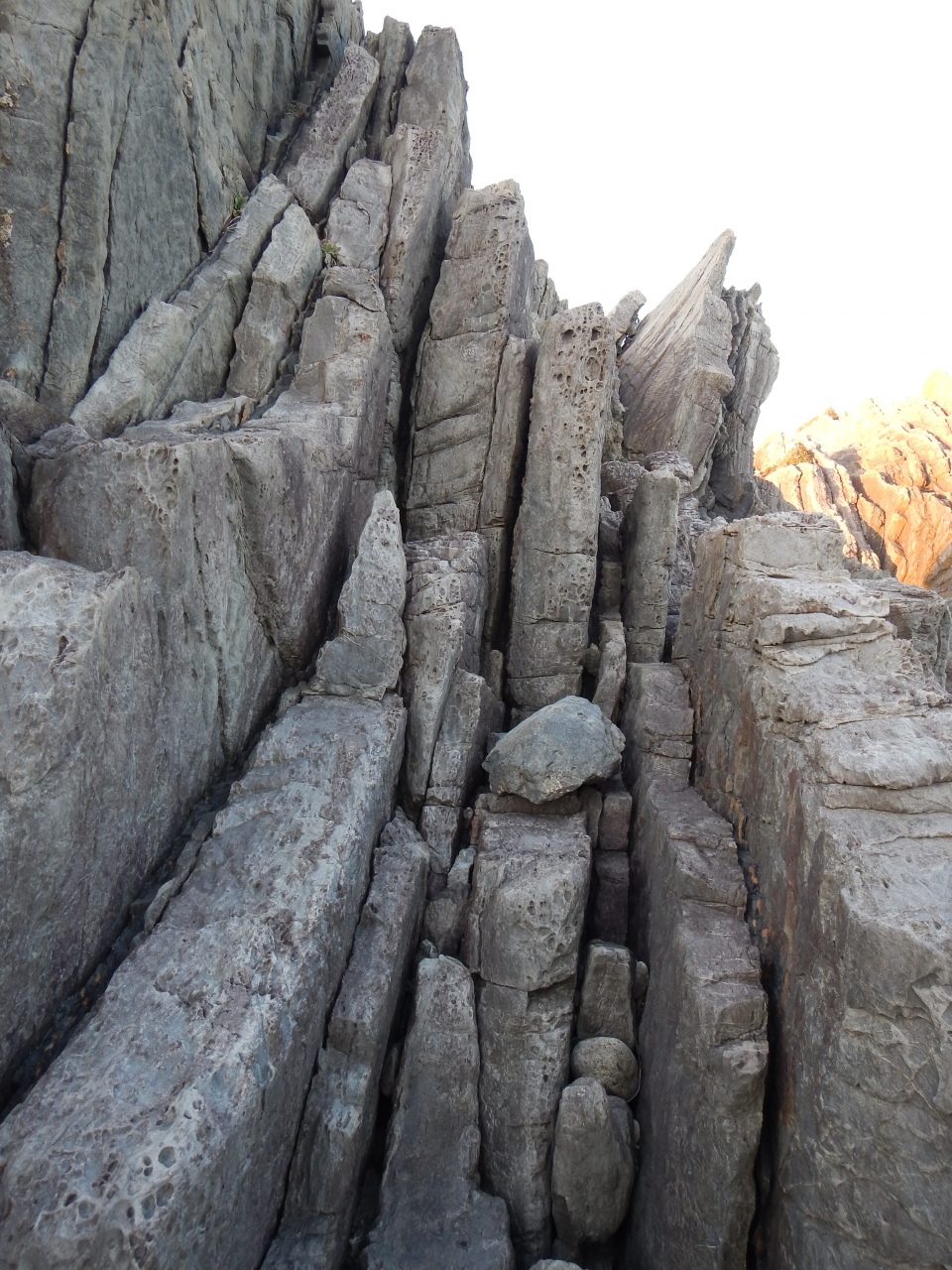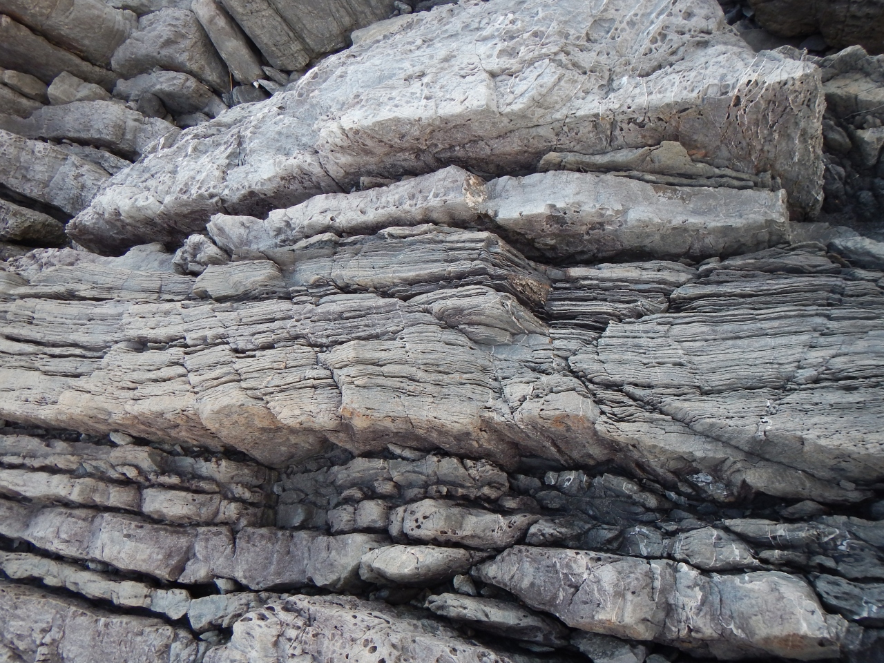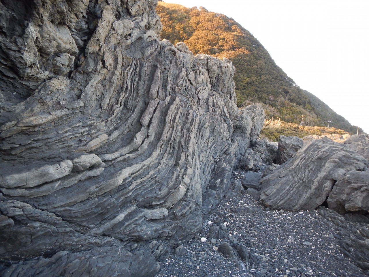 岬の先端部分の岩をよじ登っていくと、地層のすごさがわかります。岩はざらざらでごつごつしているので、足がかりがあり簡単に上り下りできますが、低いところは、満潮時に濡れて、滑りやすくなっているので注意が必要です。