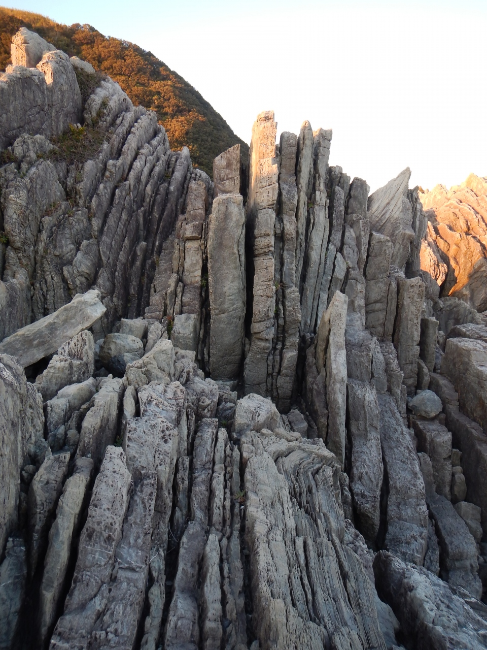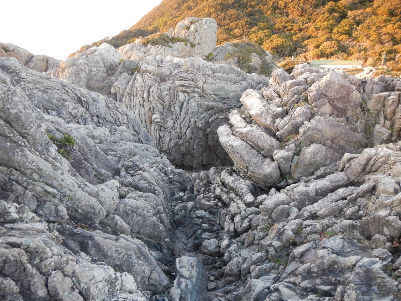 遊歩道から見ているだけでは、室戸岬のすごさはわかりません 岬の先端部分の岩をよじ登っていくと、地層のすごさがわかります