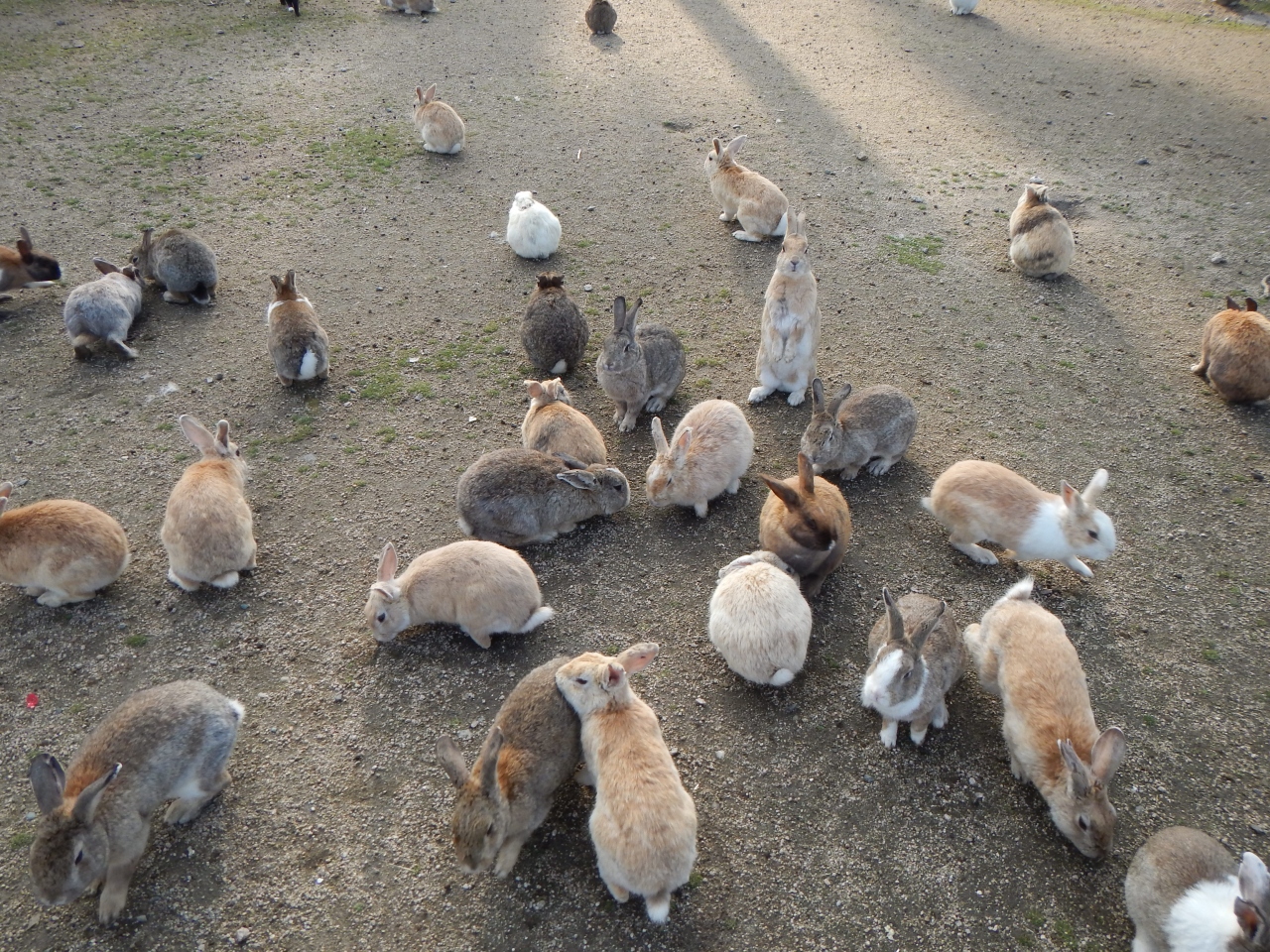 うさぎさんは冬眠しません。冬でも会えます。想定700羽以上。島のてっぺんの展望台・鉄塔のところにも、うさぎさんはいます