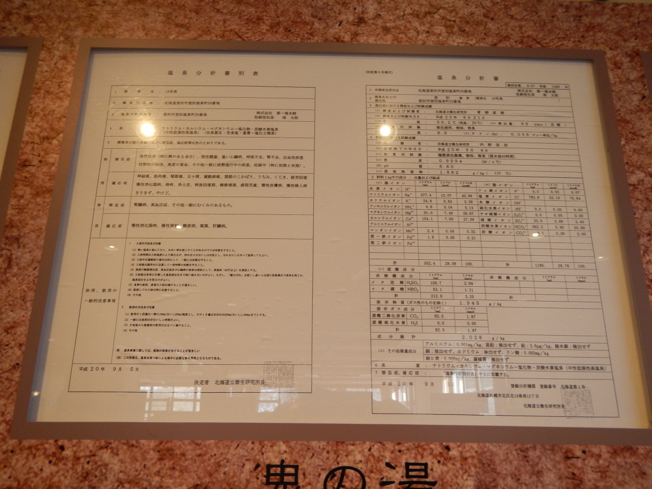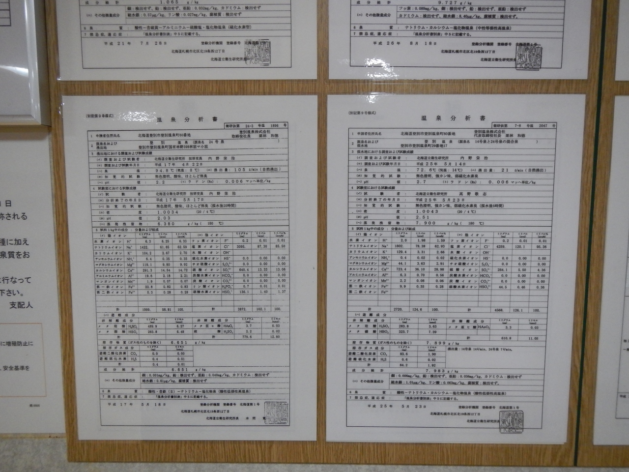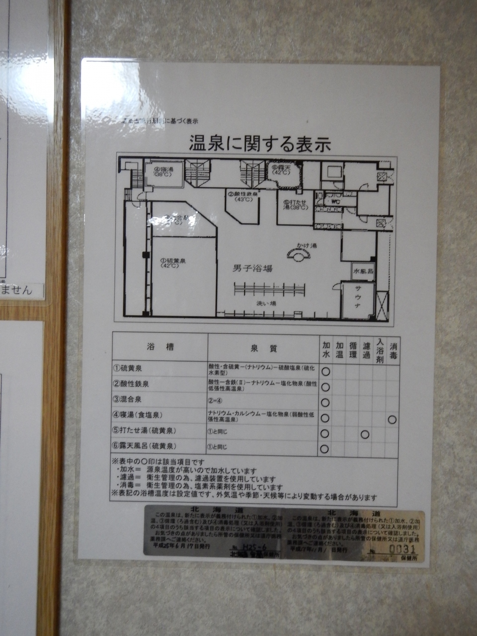 他のホテルは、3泉源4泉質のところもありますが、ここの温泉は、共同泉源の酸性硫化水素泉のみです。とはいうものの、登別を代表する白濁硫黄臭の温泉ですから問題ありません。大浴場入口は3階で、階段を上がった4階が脱衣場で、階段を降りて3階が浴室と、少し面倒になっています。- 旅行時期