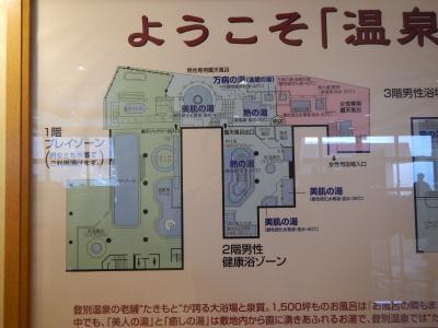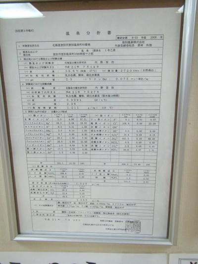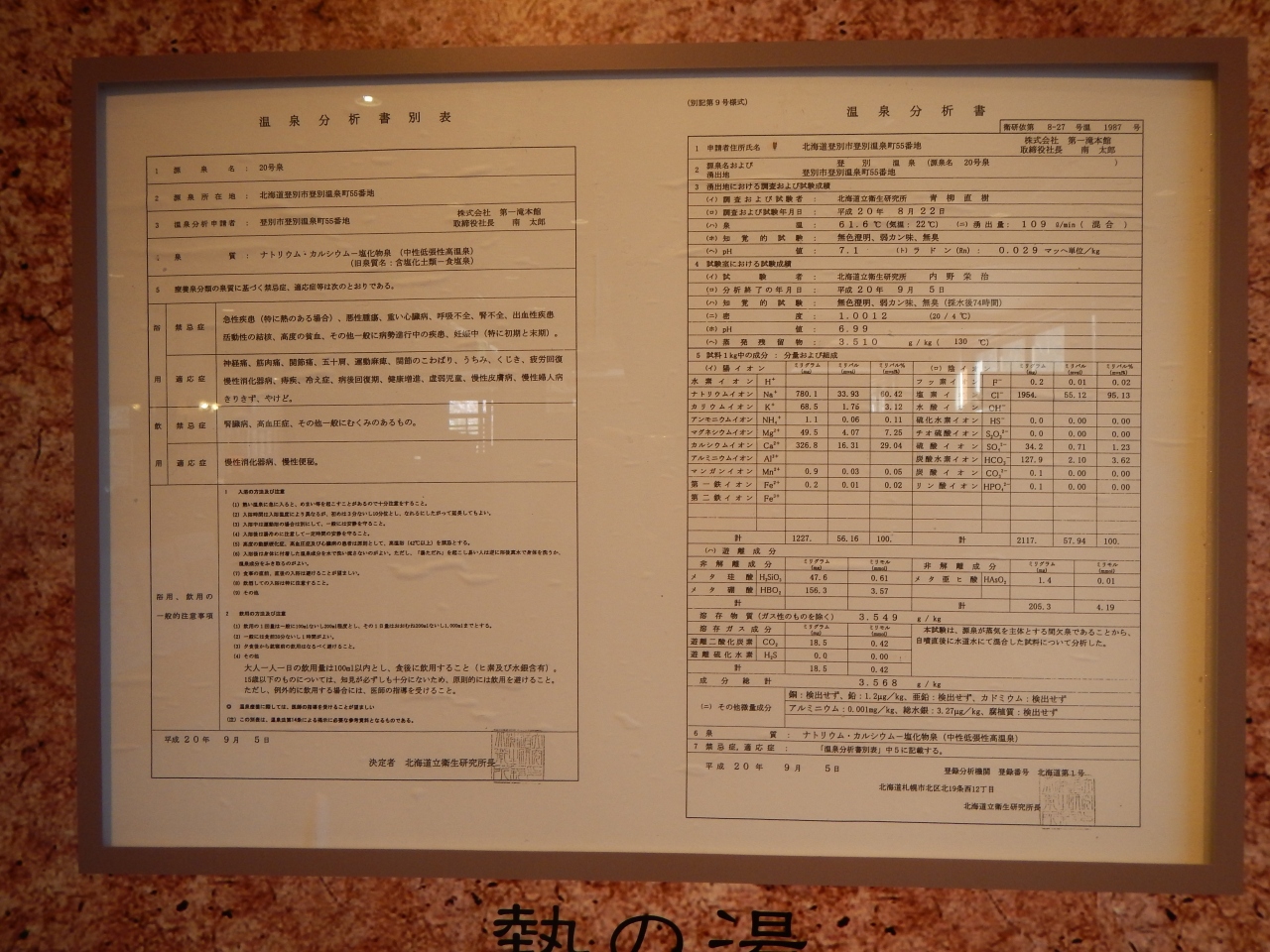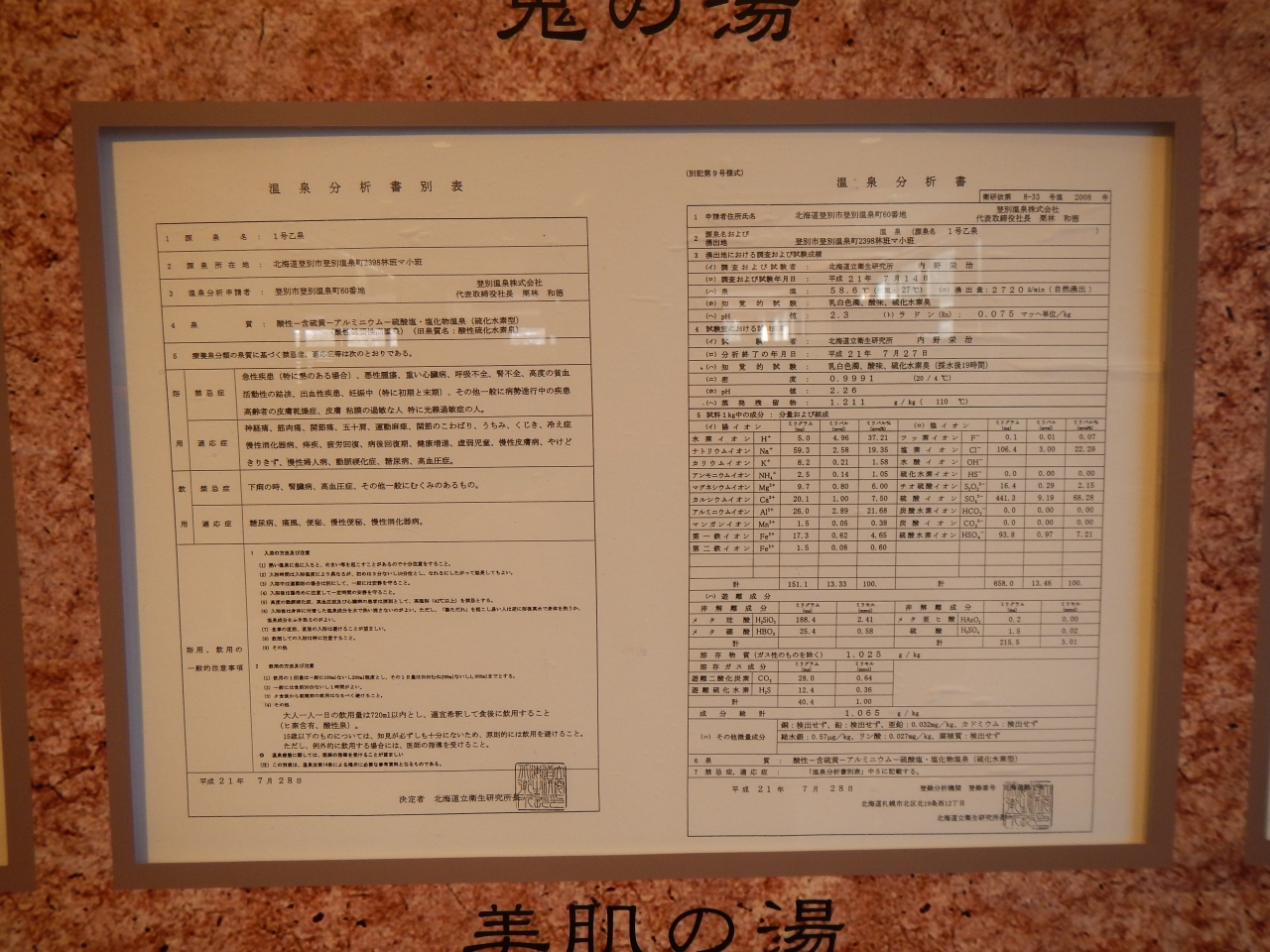 他のホテルは、3泉源4泉質のところもありますが、ここの温泉は、共同泉源の酸性硫化水素泉のみです。とはいうものの、登別を代表する白濁硫黄臭の温泉ですから問題ありません。大浴場入口は3階で、階段を上がった4階が脱衣場で、階段を降りて3階が浴室と、少し面倒になっています。- 旅行時期