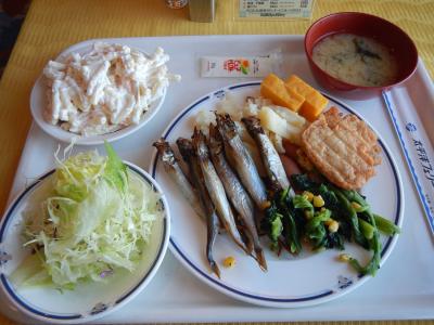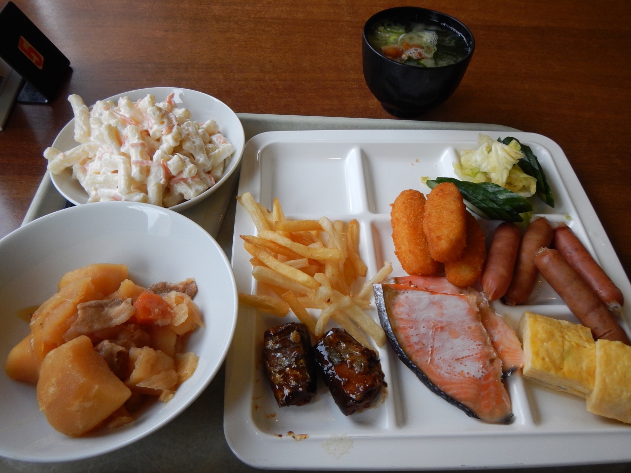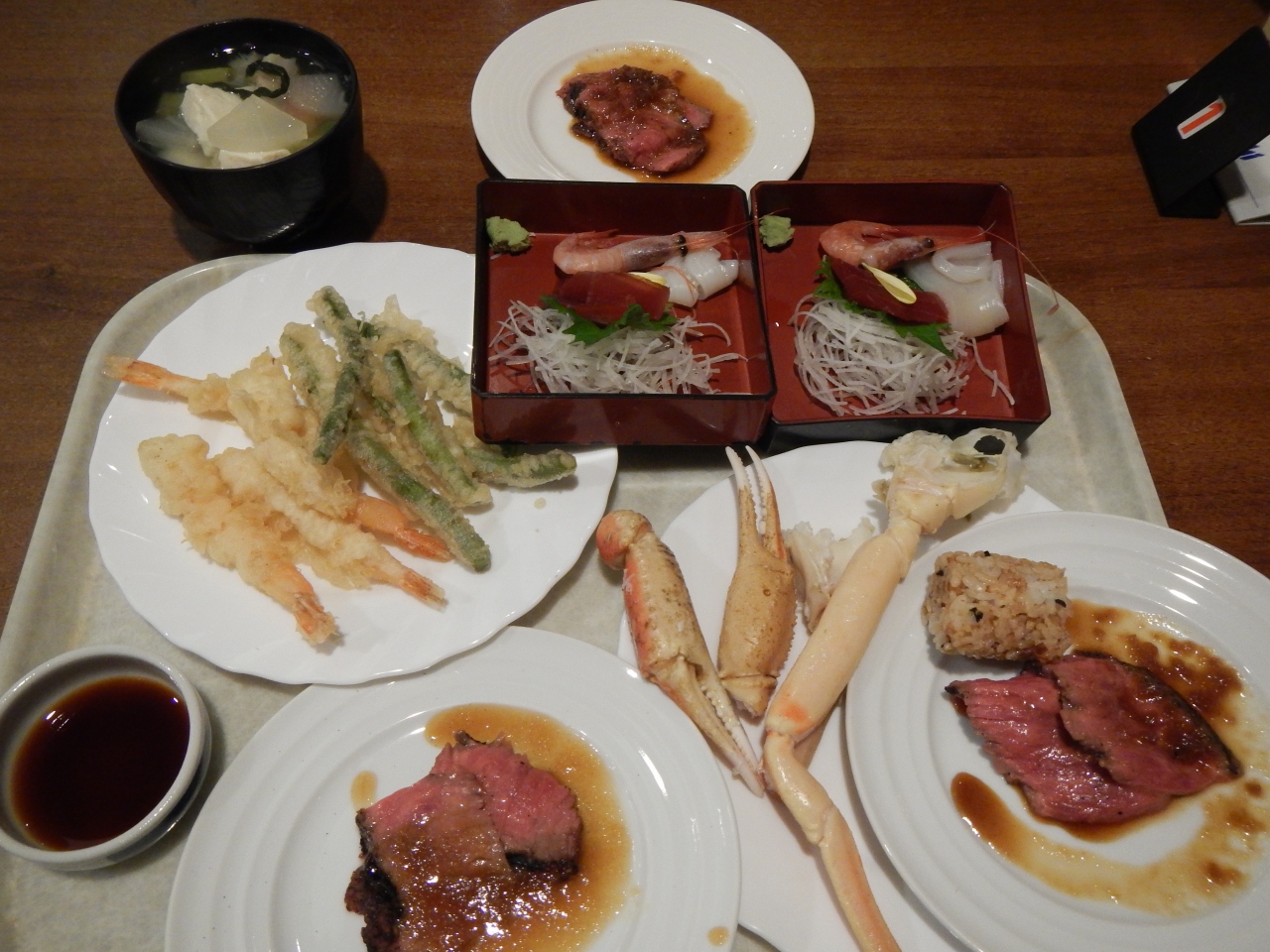 食事は朝夕ともバイキングです。夕食には、ステーキ・カニ・ジンギスカン・刺身もありました。