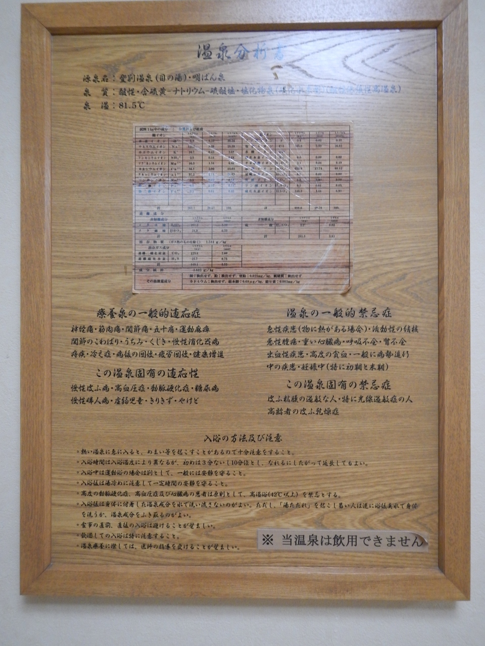 それと今回、残念なことに、売り物のさまし湯(源泉掛け流し100%100℃近い源泉を加水せずにさましてある湯)が熱すぎて入れませんでした。加水すれば入れますが、それでは意味がありませんので。- 旅行時期