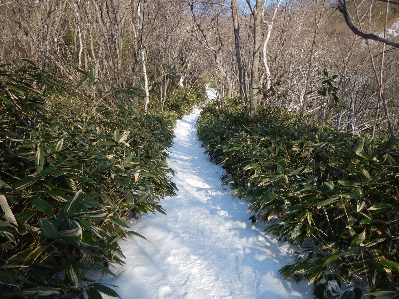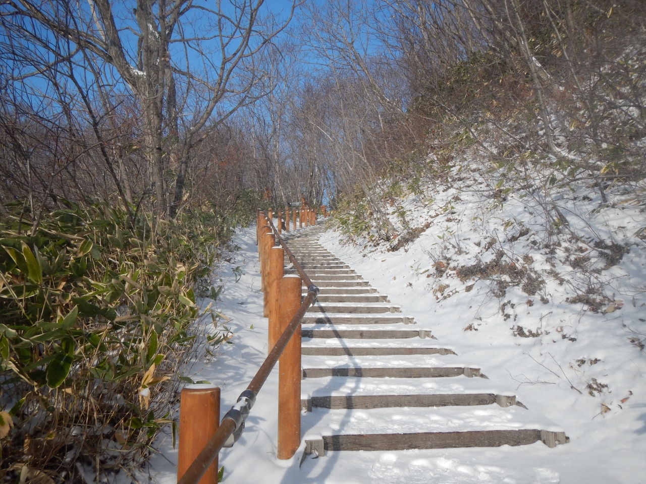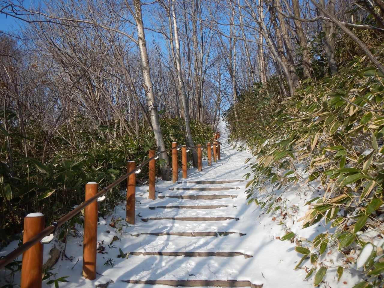 2014年12月積雪が凍結して、アップダウンの探勝路は、滑りやすく、非常に危険な状態でした。手摺やロープが張ってある場所もありますが、大半は、普通の山道です。