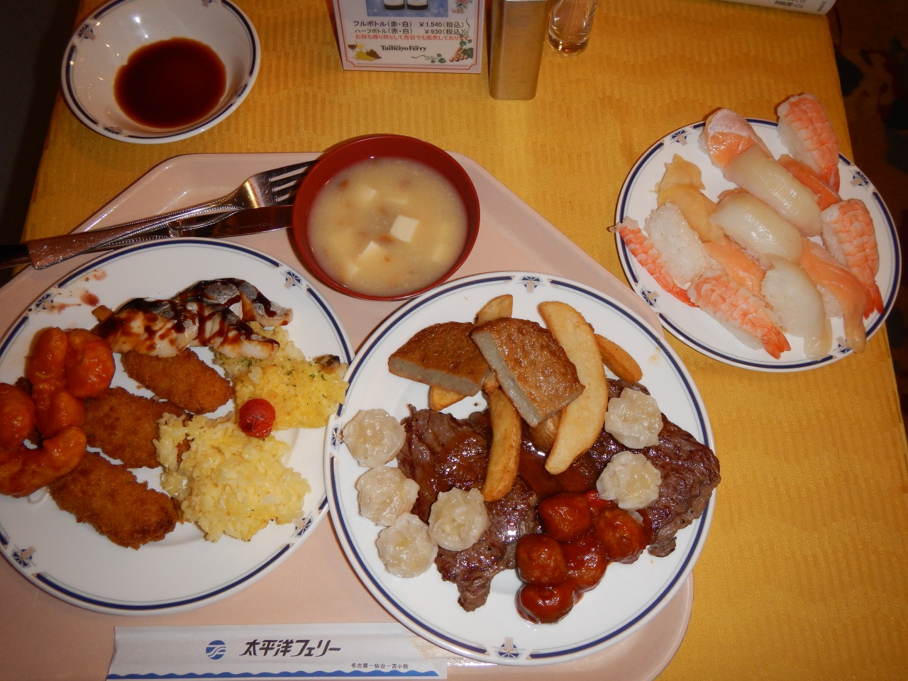 食事はバイキングで夕食2000円朝食1000円です。港近く以外ではWiFiの電波はほとんど届きませんでした。船内WiFiもありますが、事前登録が必要です。
