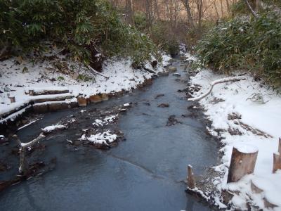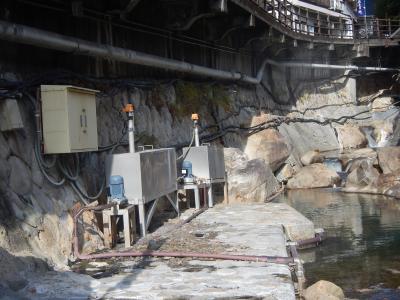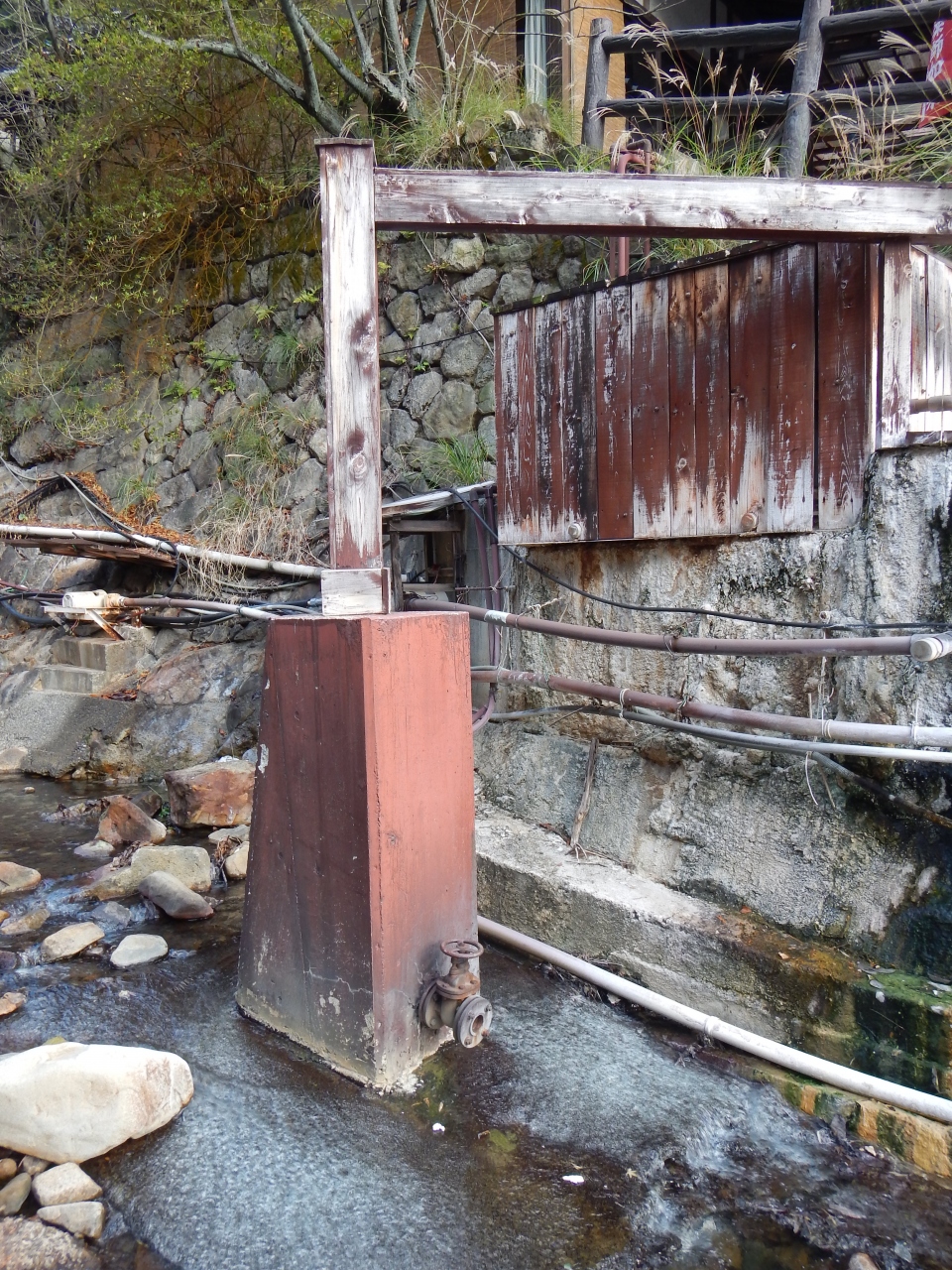 2014年12月今年6回目の湯の峰温泉です。川に源泉をくみ出す井戸が立っています(写真参照)その各旅館に供給する配管の継ぎ目から、本物の源泉があふれて流れています。