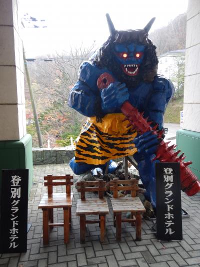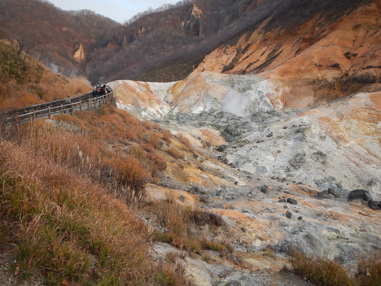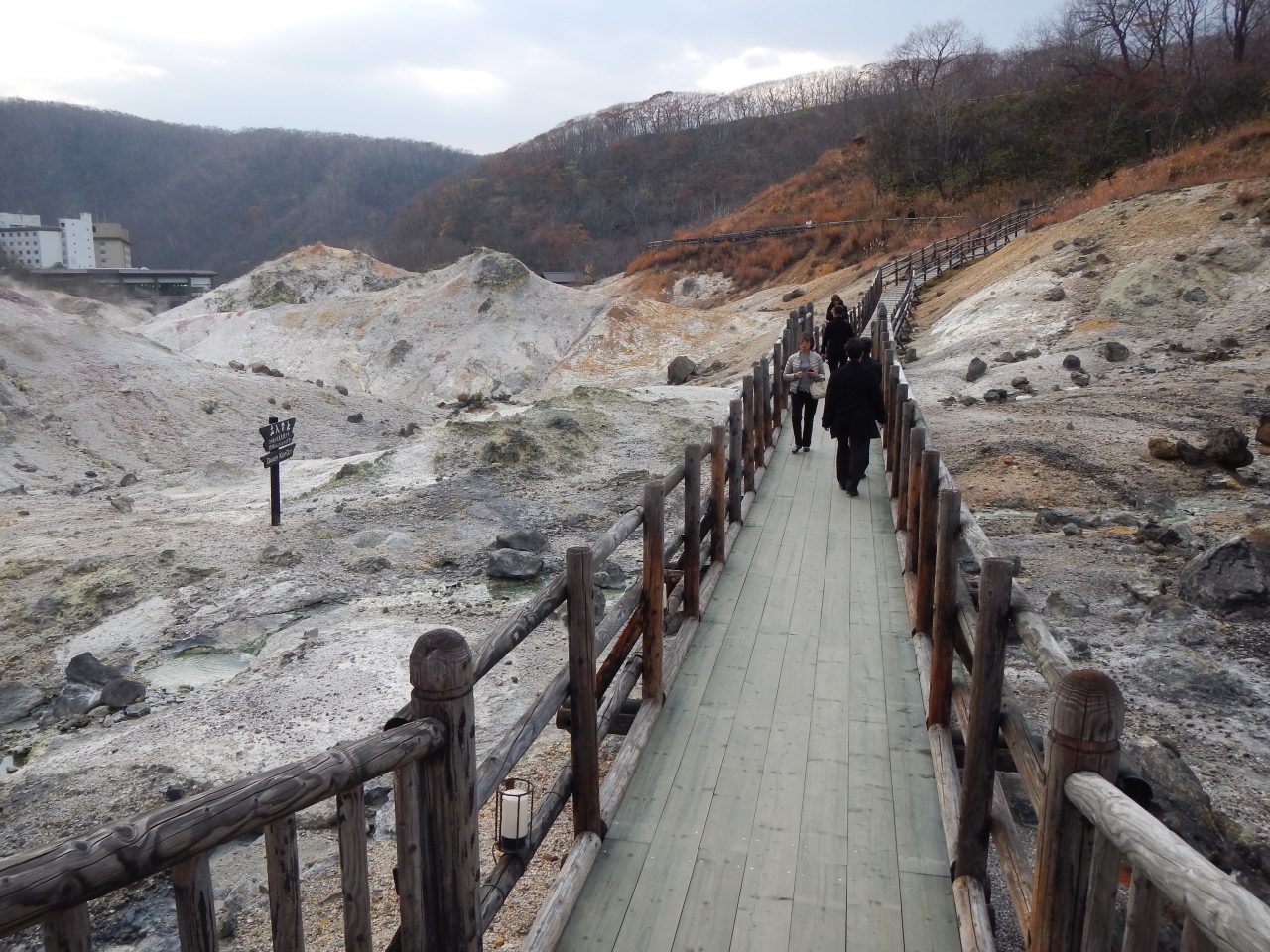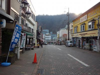 まんなかに車の通るメインストリートがあって、その周りに大小のホテル・旅館が建ち並んでいます。一番奥が地獄谷です。登別温泉のバス停は3箇所あるので、確認して降りる必要があります。といっても、メインの通りは500mほどです。