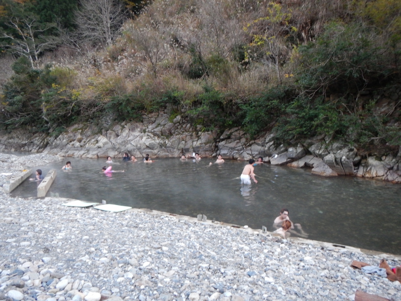 底の砂利から温泉が湧いて出てきますが、その部分だけは熱いですが、川の水が入ってきてますので、大部分はぬるいというか、冷たいです。川の水が流れ込んでくる上流側より下流側のほうが、温かいです。