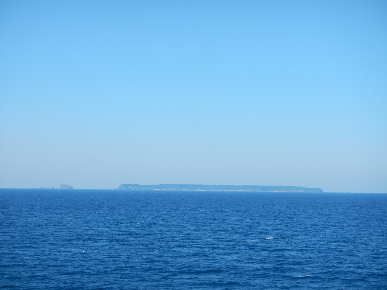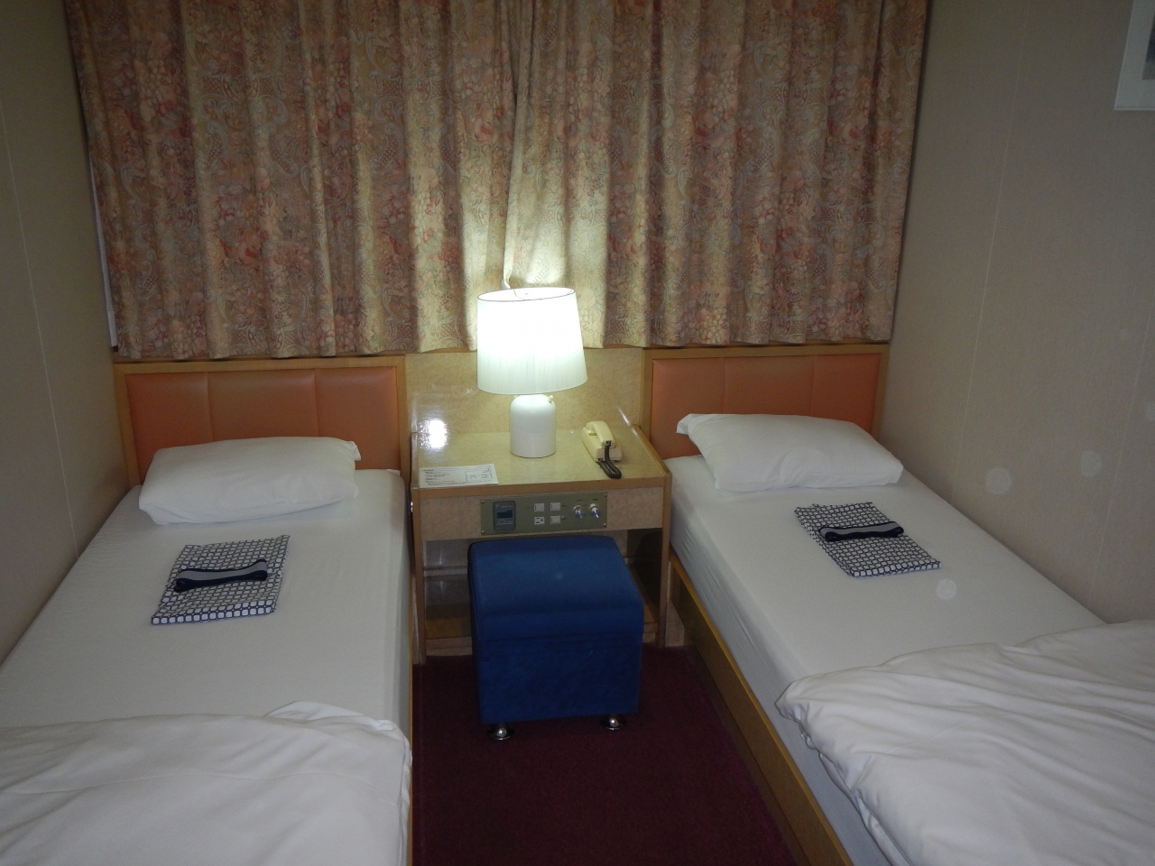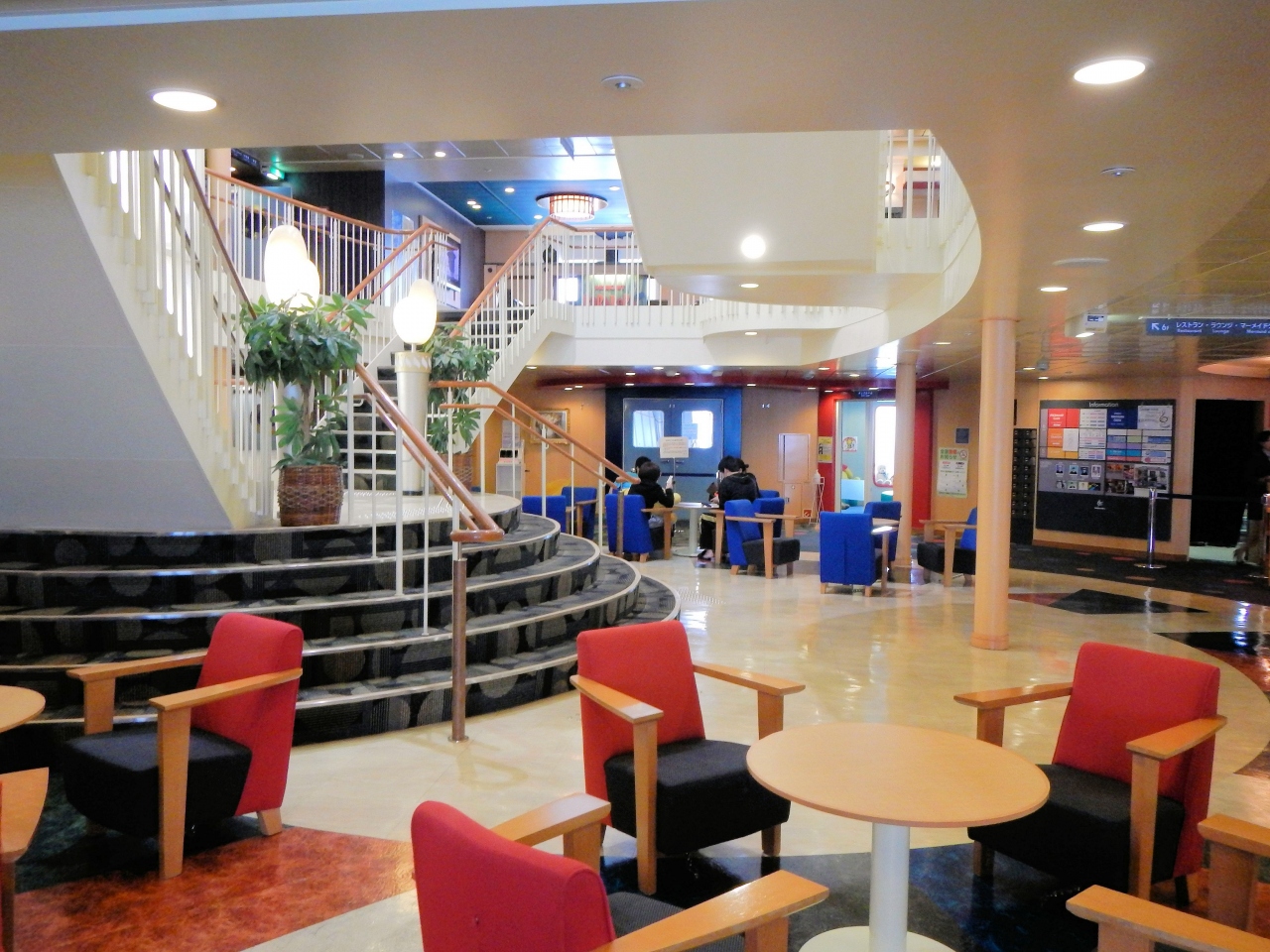 2014年9月、苫小牧−秋田−新潟−敦賀の経由便を予約しましたが、台風の影響で、新潟・敦賀間は欠航となり、苫小牧−新潟間を乗りました。相変わらず、所構わず喫煙して、ポイ捨てする客がいます。デッキのジャグジーは9月以降は閉鎖されていました。秋田沖の飛島、新潟沖の粟島が見えます。船内放送もありました。また、海上から鳥海山も見ることが出来ました。ビンゴ大会・コンサート等の船内イベントもありました。この時期は追加料金無しで、1等船室の貸し切りが出来ました。