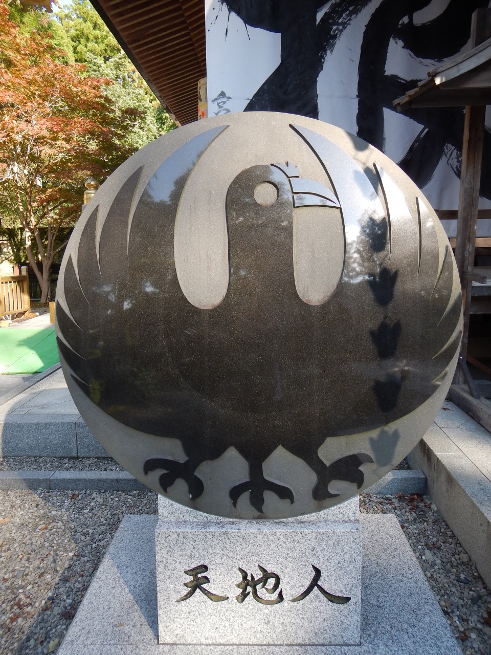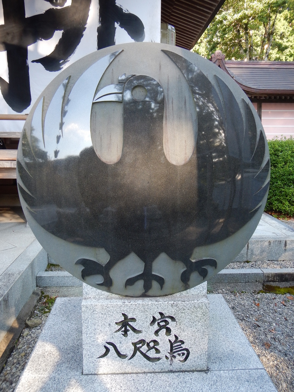 本殿前の工事は終わってました。黒い八咫烏のポストがありました。本殿には拝むところが5箇所あり、拝む順番が決まっています(本殿の門の手前左側の看板に書いてあります)