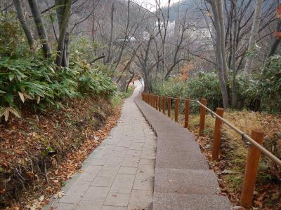 ぐるっと回れます 地獄谷方向の行き止まりには、間欠泉があります。入場無料。2014年10月末の平日の昼間、アジア系外国人の方の団体が多かったです。