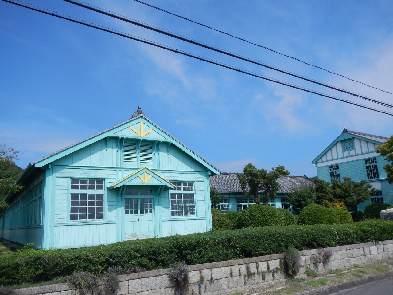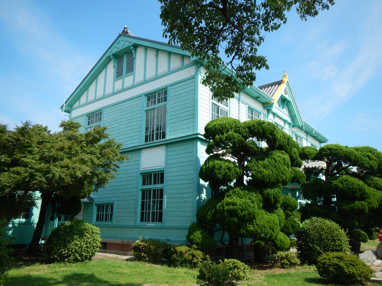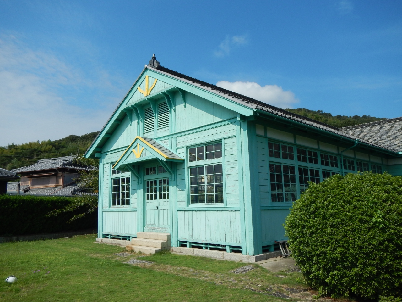 国立粟島海員学校といっても、今は廃校になっています。洋風校舎は部分保存されて、そのままの形で粟島海洋記念館となっています。うす緑色の校舎が海岸に映えています。登録有形文化財です。