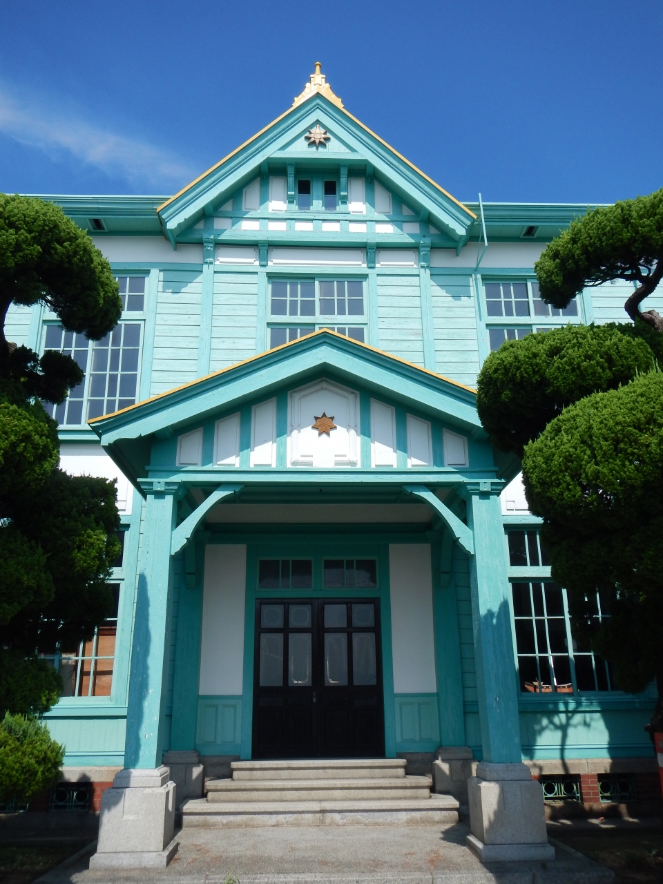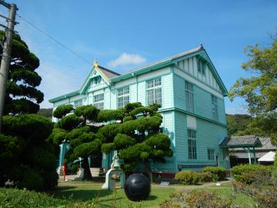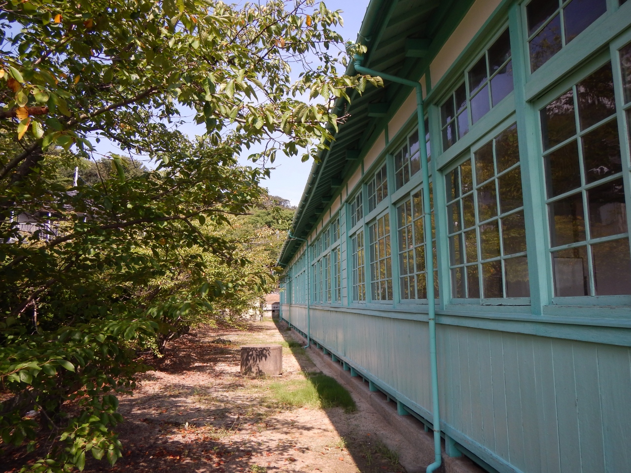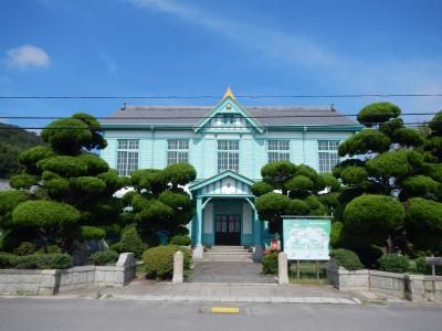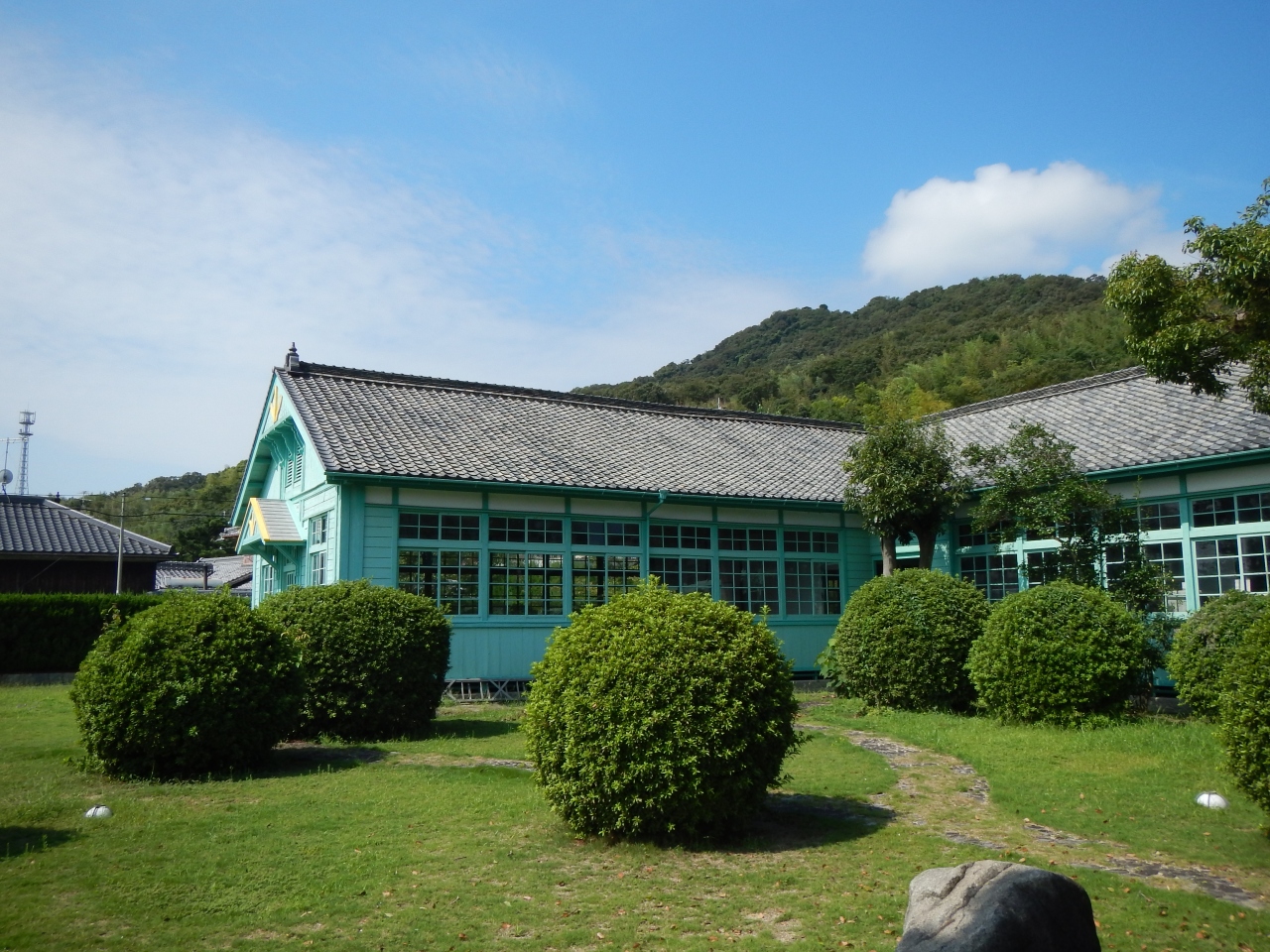 国立粟島海員学校といっても、今は廃校になっています。洋風校舎は部分保存されて、そのままの形で粟島海洋記念館となっています。うす緑色の校舎が海岸に映えています。登録有形文化財です。