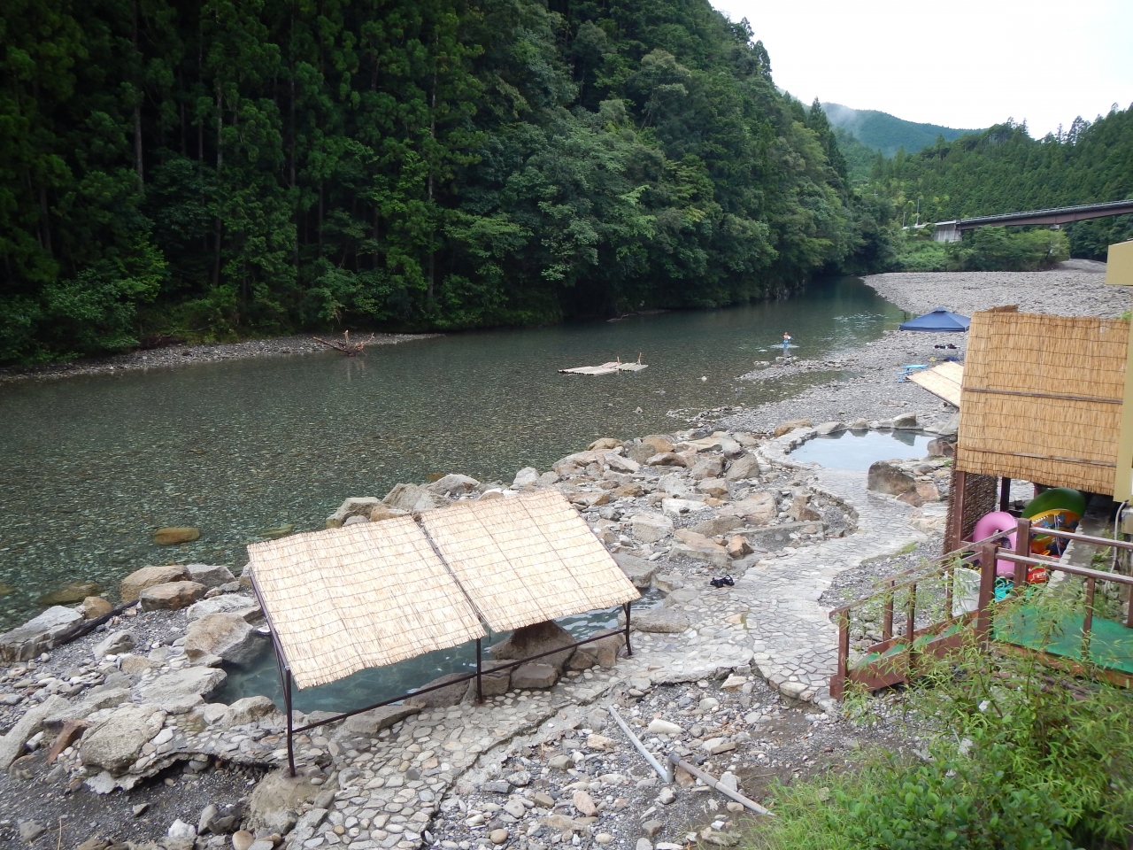今年(2014年)5回目です。8月下旬の土日です。今までは、こんなことは無かったのですが、昼間は河原で水遊びする家族連れが露天風呂を占領していました。早くにチェックインして、河原の露天風呂に入ろうと思ったりですが、無理でした。日が暮れてからと、早朝6時くらいまでしか、露天風呂に入れない状況でした。夕食に天然鮎の塩焼きがあるのが最高です。バスの時間がかなりあったので、バス停から電話すると迎えに来てもらえました。