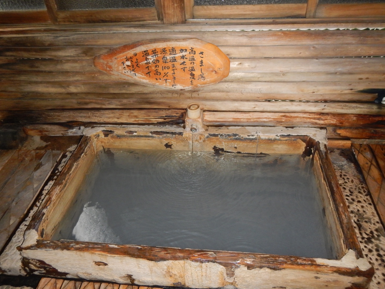 源泉掛け流し100%のさまし湯は、1人しか入ることができないくらいの大きさですが、若干白濁していて、硫化水素臭があり、効くという感じがすごくします。- 旅行時期
