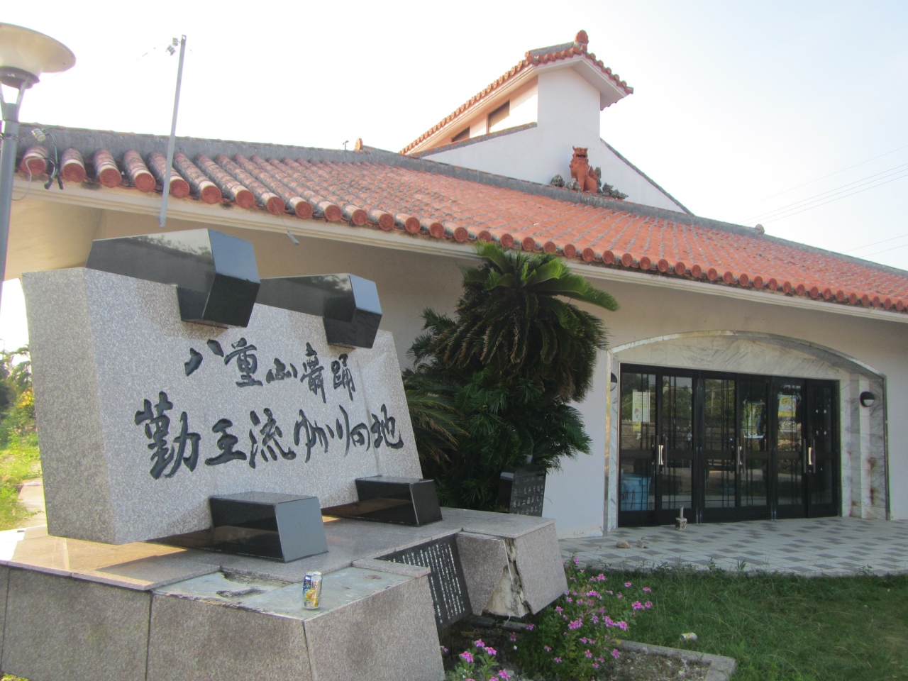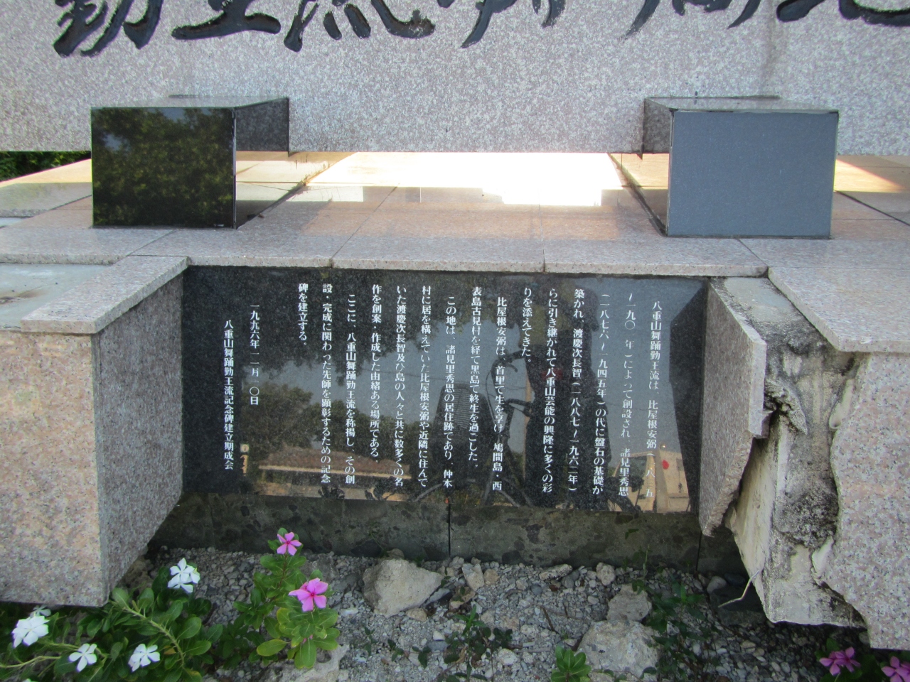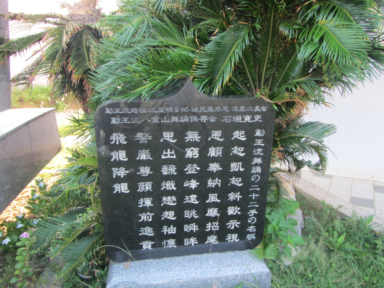 黒島 東筋 黒島伝統芸能館の横に立てられています。八重山舞踊勤王流については、説明が書かれた碑の写真がありますのでそれを見てください。1996年に建立されました。二十二手の名称についても、別の碑の写真にかかれています。