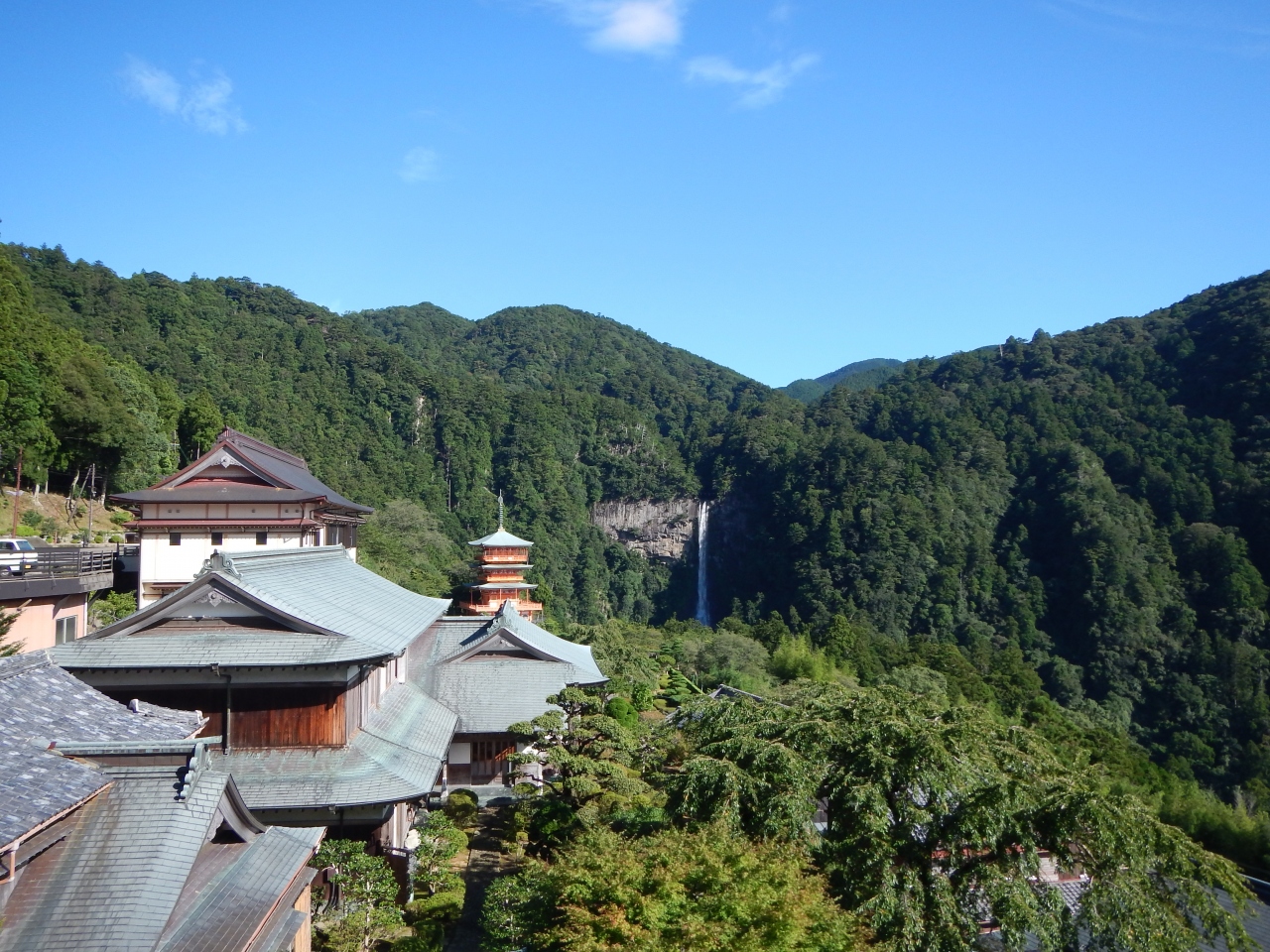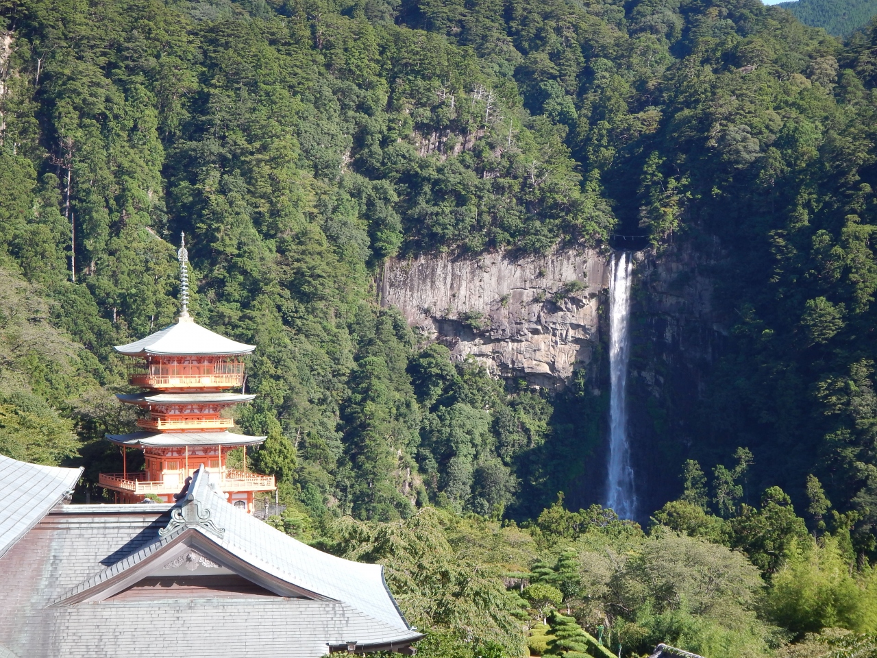 那智山青岸渡寺からの那智の大滝も定番です。朱塗りの三重塔の横に那智大滝が見えている写真です。間近で見る水しぶきや轟音の迫力はありませんが、写真の定番は、那智山青岸渡寺です。うれしいことにここからの那智大滝は無料です。